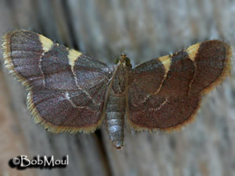 Identification: Similar to Hypsopygia costalis, but slightly larger. Ground color varies from rose to deep purplish. Widened tops of am. and pm. lines more triangular. Yellow fringes on all wings, but narrower.
