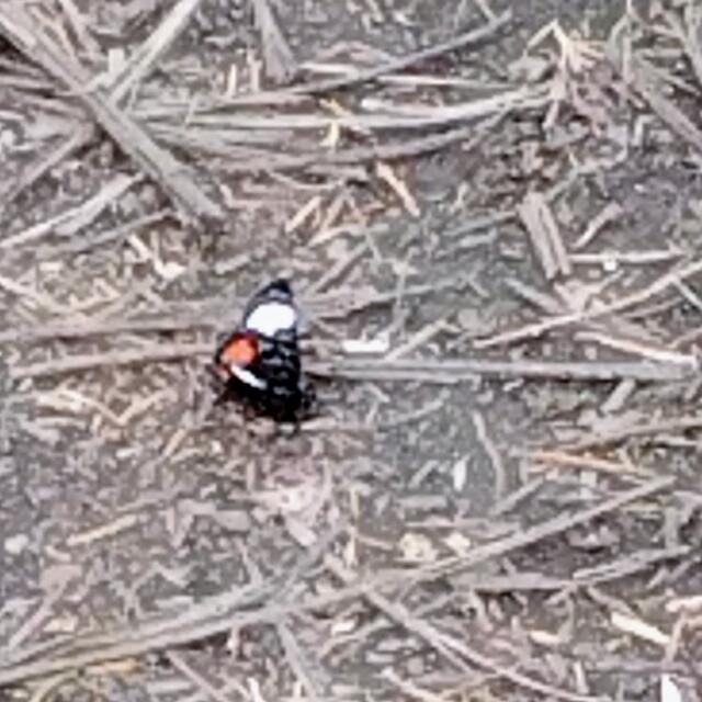 Identification: Body and wings are black; large white patch on forewing and red patch on hindwing; forewing has inconspicuous metallic shading.