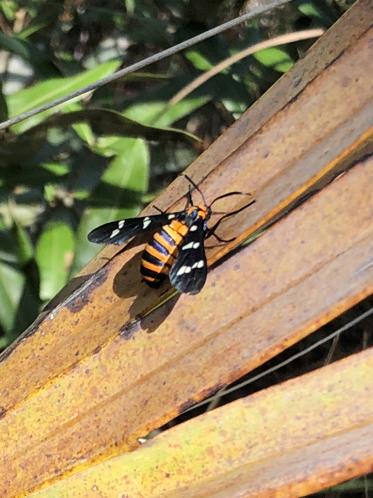Observation notes: Yellow-banded wasp moth was observed on yellowing saw palmetto leaf on a sunny midday field trip by botany & AP Statistics students from José Martí MAST 6-12 Academy, an MDCPS math & science magnet school. Temperature was 85F.