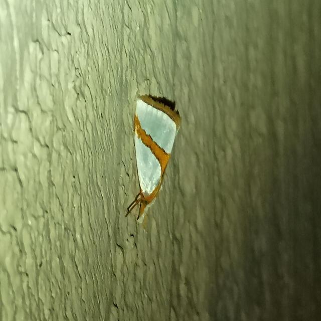 Identification: Forewing silvery white with yellow or orange median band that does not widen distally near inner margin; terminal band and fringe yellow or orange (same color as median band); hindwing white