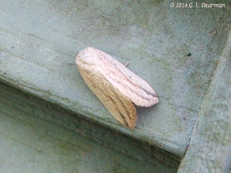 Observation notes: Found after sunrise on a wall under a white porch light that had been left on all night.