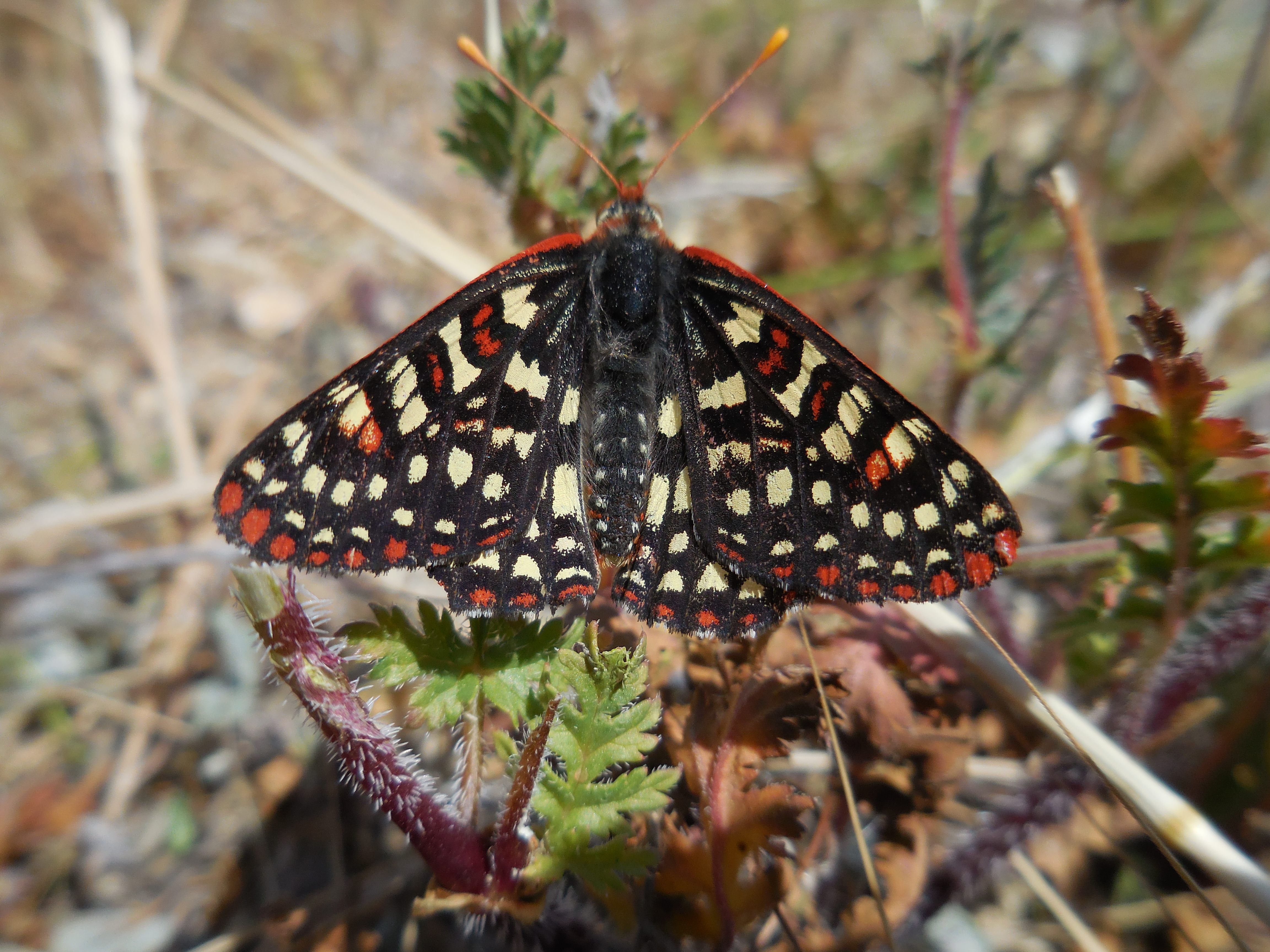 Observation notes: The butterfly was observed at approximately 1400. The weather conditions were clear, approximately 4-7 mph winds, and 75° F. The butterfly was not very active and only moved a few feet during the approximately 10 minute observation period.
