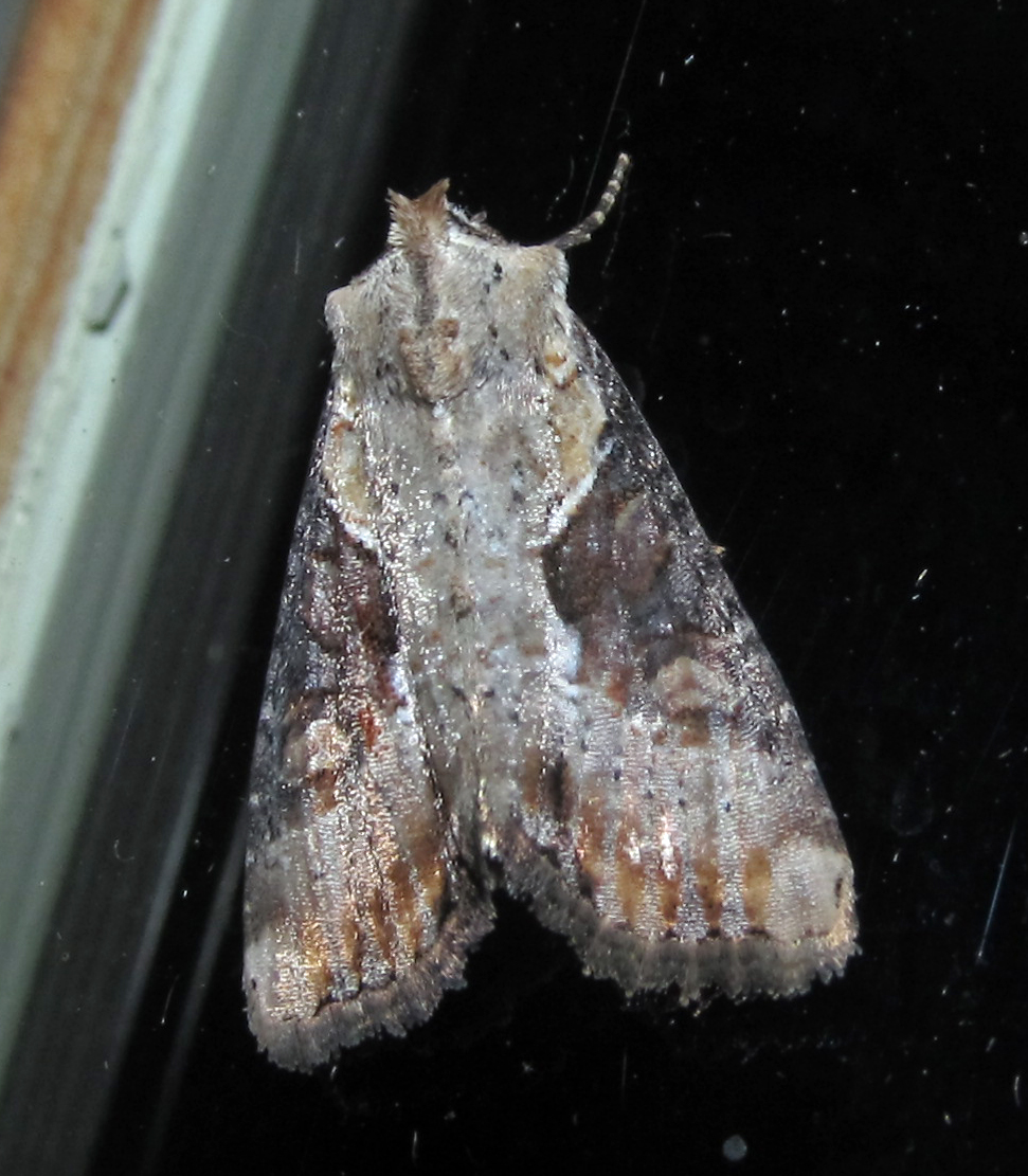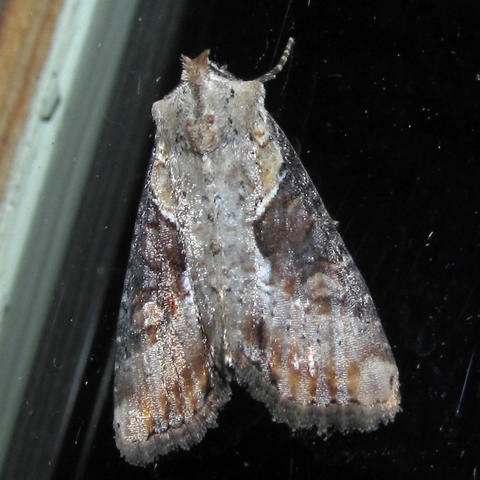 Observation notes: About 1 inch length, gray with brown patches on wings, head has a prominent shape
