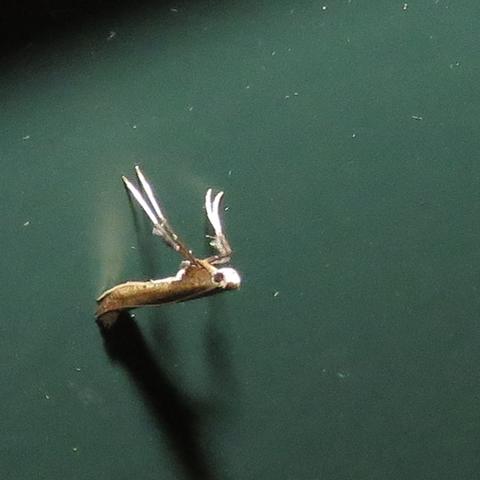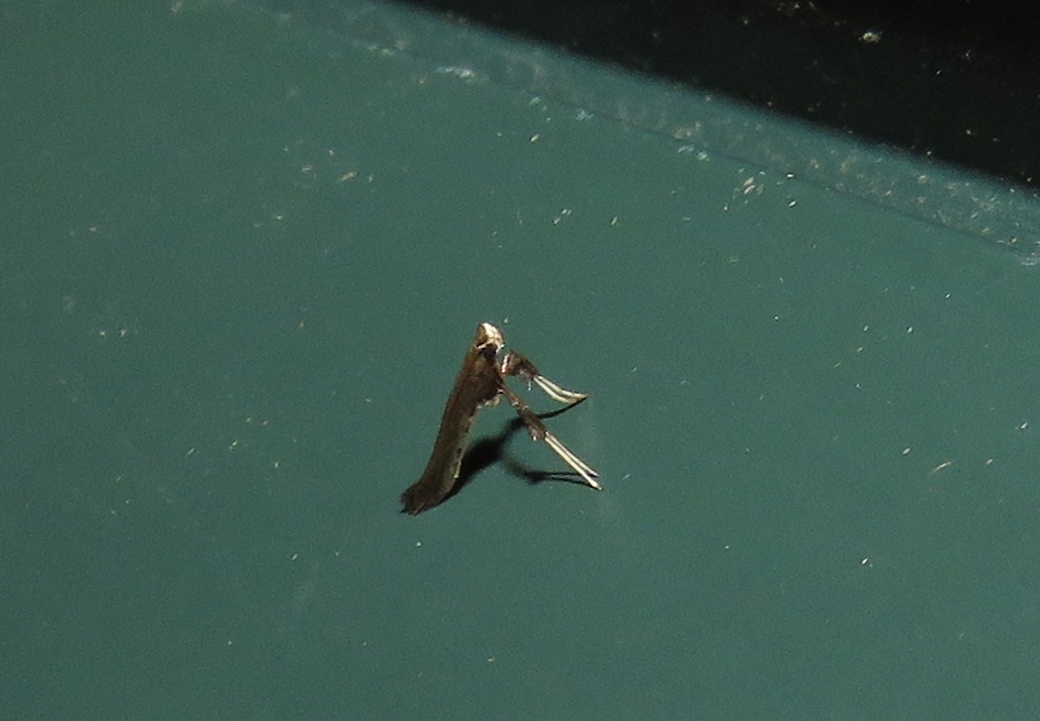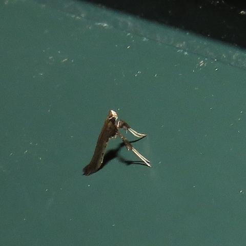 Observation notes: Found near the porch light. Small thin moth with TL of about 7 mm, propped on the forelegs. Black and white pattern can be seen in the photos.