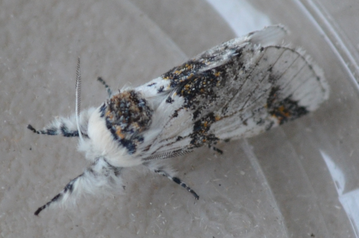 Observation notes: Captured while flying about the patio light. Placed in plastic container where it laid 35 eggs overnight. Will show 2 more pictures in next submission. The top has been off the container for over 2 hours, but the moth is staying with the eggs in the container. Larvae feed on Willow and Cottonwood, possibly Birch. Will try it.