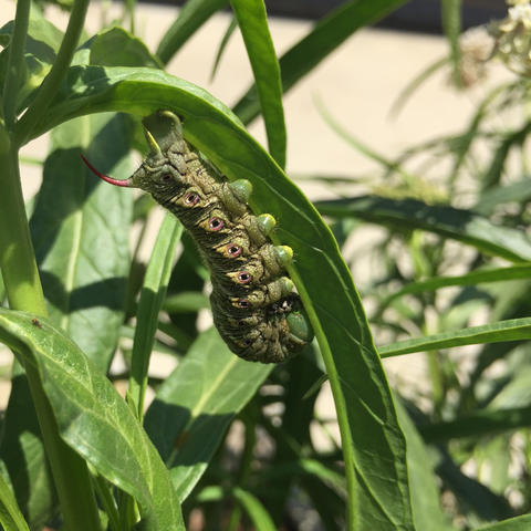 Observation notes: Caterpillar was holding onto Narrowleaf Milkweed leaf but wasn't observed eating the milkweed. Milkweed was located in organic garden of school. Sunny day in the 70's F.