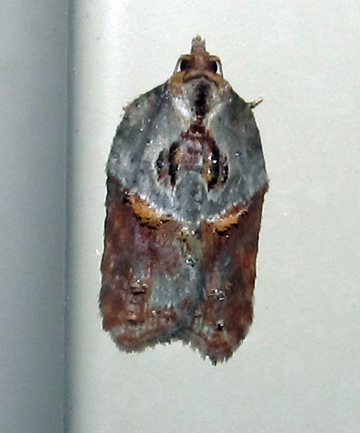 Observation notes: Odd photograph but the colors and shape are correct -- about 1/2 inch length, red bottom half with white, gray and black top half, two colored areas separated by tufts of cream-colored