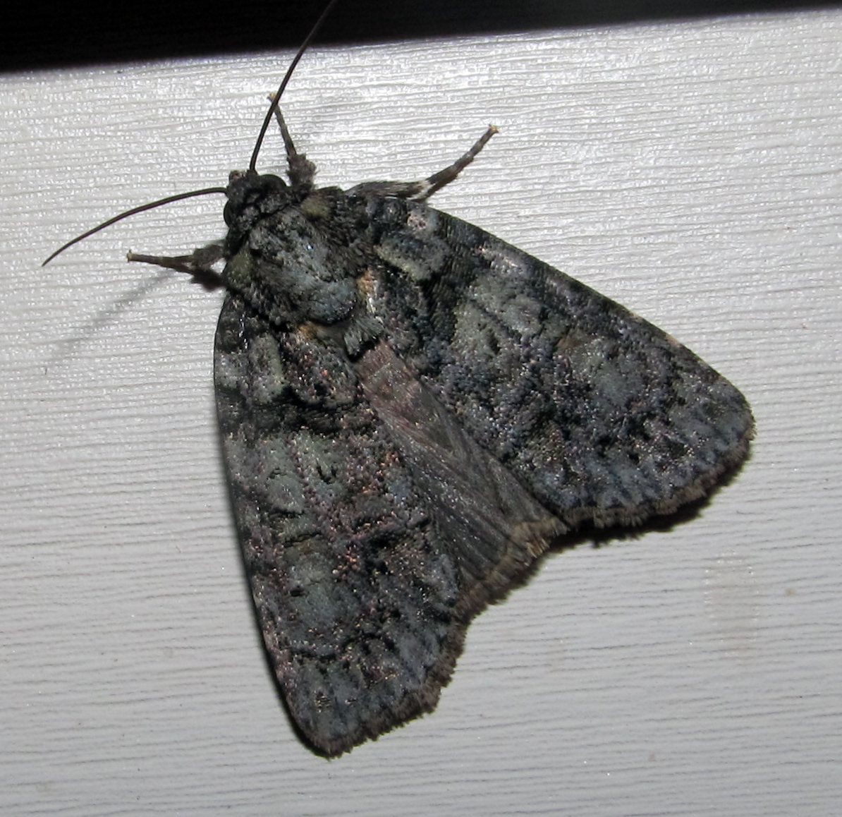 Observation notes: About 1/2 inch wingspan (as shown), gray/greenish moth with subtle black patterns, it has a "cape" with darker greenish/gray near the head