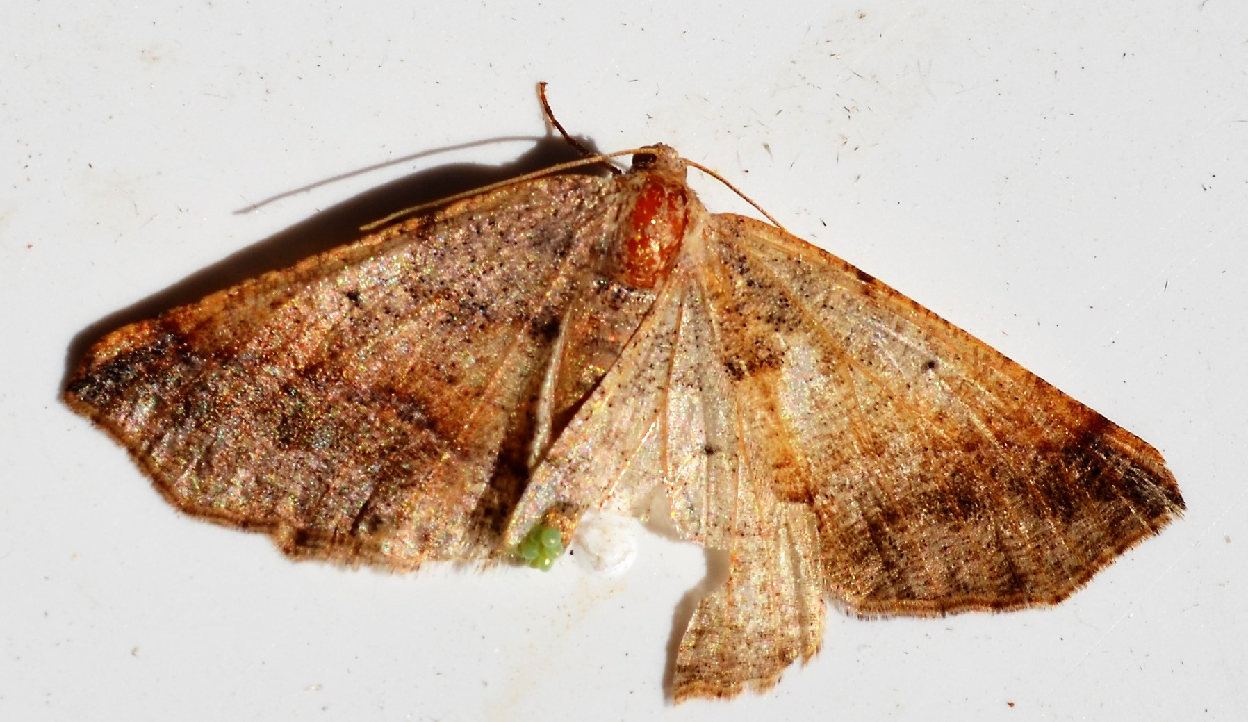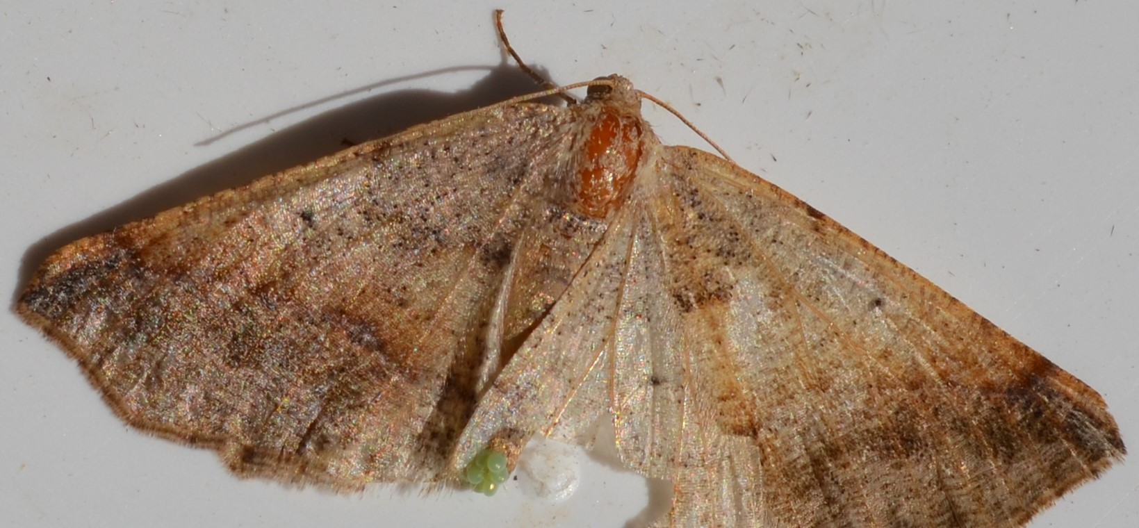 Observation notes: Nearly dead appearing moth, resting on door frame near patio light