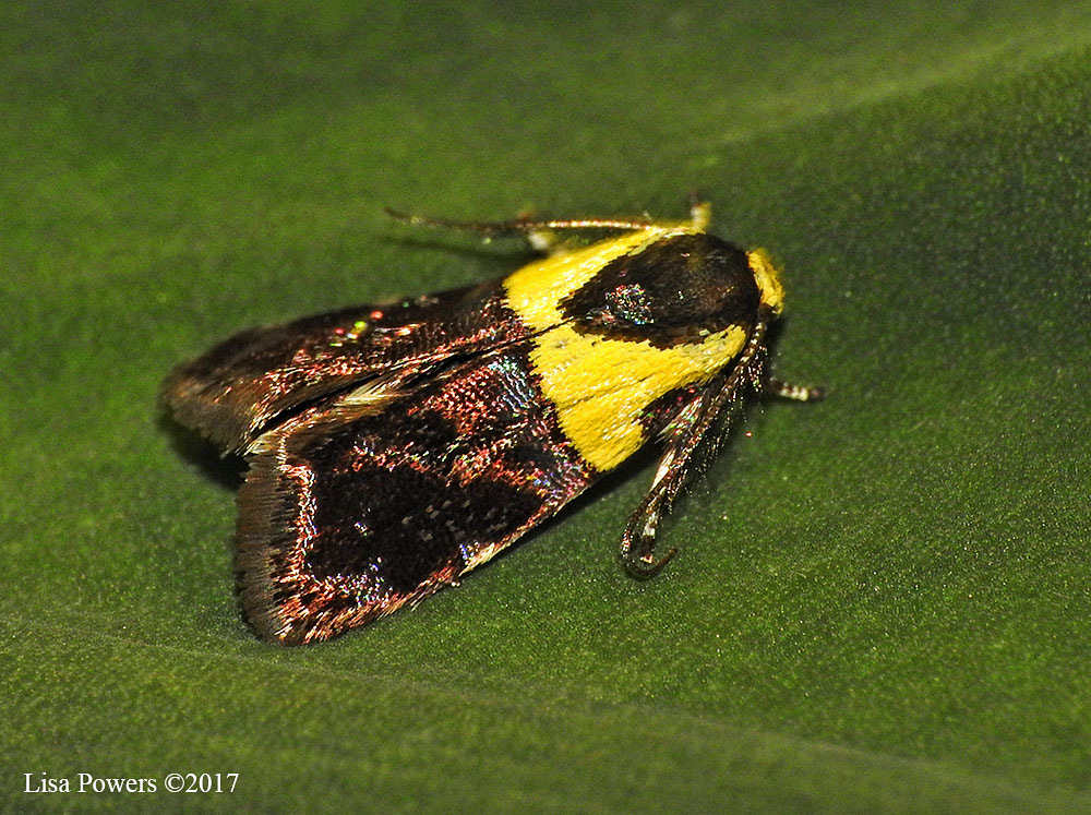 Vibrant pink and yellow moth with a very fuzzy body. ~25 mm long.
