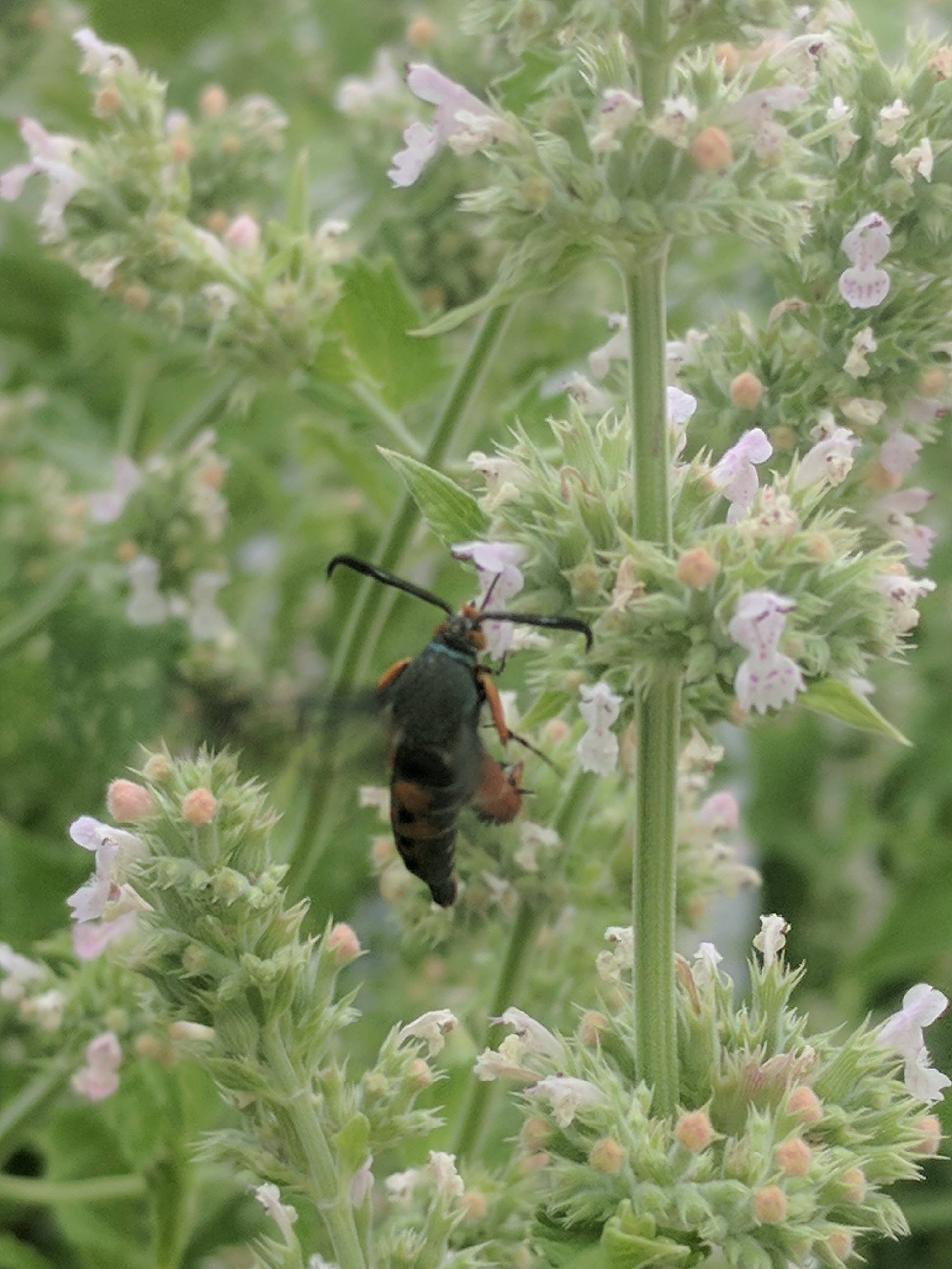 Observation notes: Flying around on a catnip plant. It looked like a wasp at first but with unusual orange/blue body color.