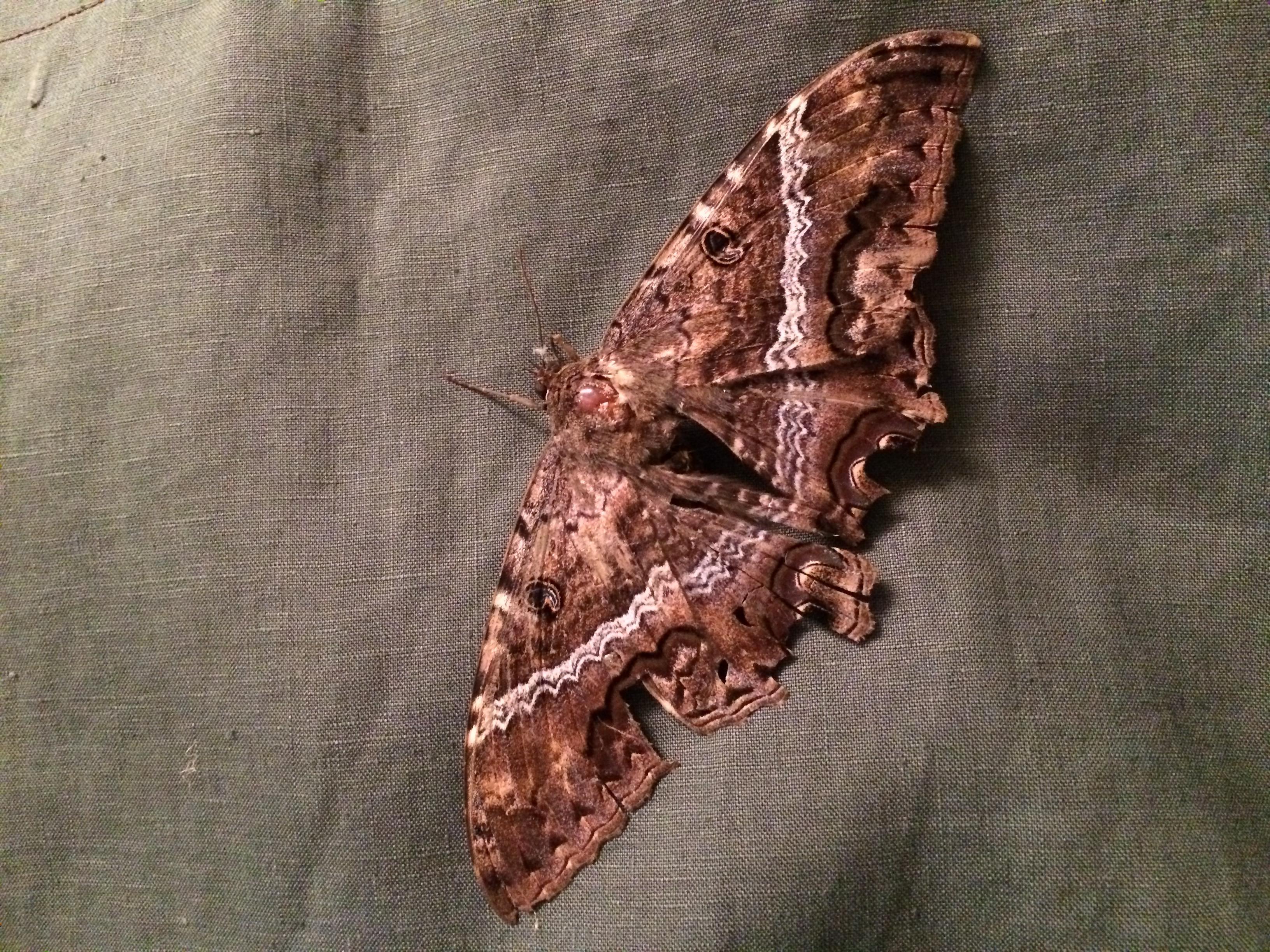 Observation notes: This moth was found in the middle of the night, around 2am. It's an old adult, slow moving and missing some sections of wing.