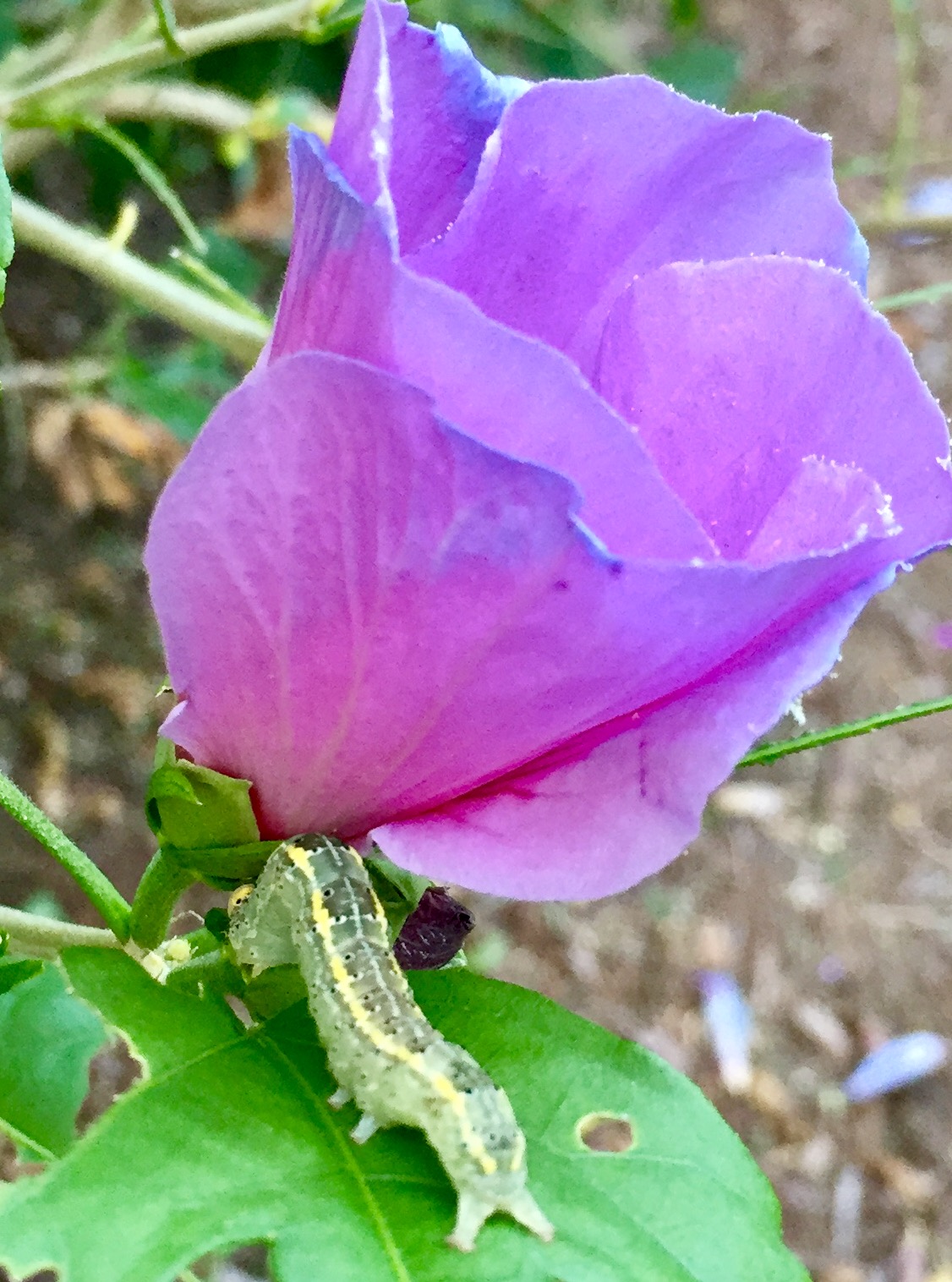 Observation notes: A healthy, fully leafed and starting to blossom Rose of Sharon bush was completely denuded of leaves within days by this infestation of caterpillars. Another smaller Rose of Sharon 6 feet away was untouched. My eagle-eyed husband spotted the culprit caterpillar because even when pointing out the damage and my being just a few feet away, I could not spot this caterpillar. It's incredible how much they blended into the twigs. They appeared to be at different stages of development, getting darker and larger with age.