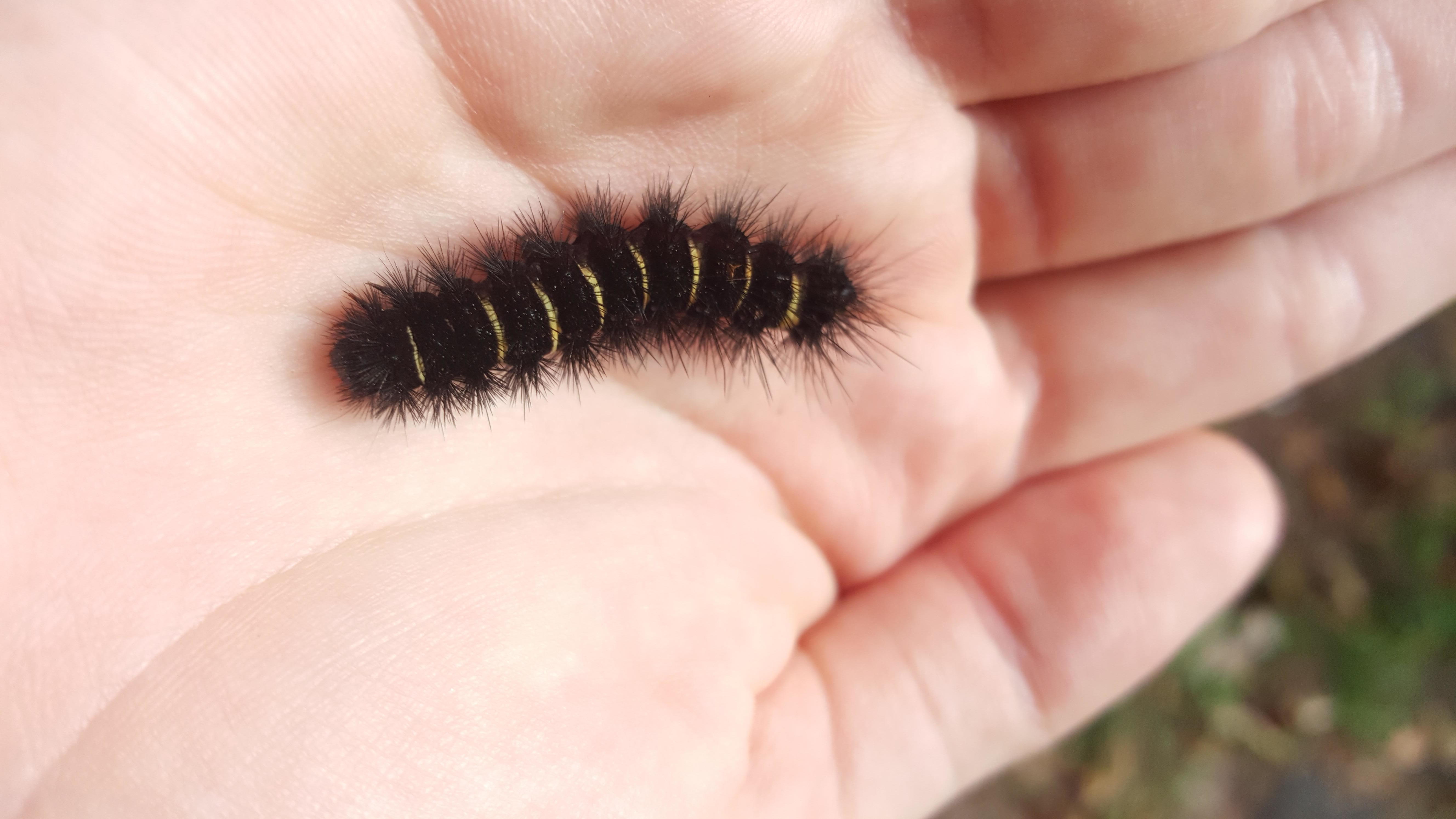 Observation notes: Smaller than the red-banded woolly bear caterpillars (which are giant leopard moths, Hypercompe scribonia)