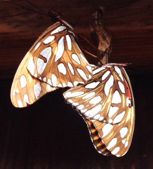 Observation notes: Two new Gulf Fritillary butterflies (Agraulis vanillae) drying their wings were observed on a fence near Passion vine. There was a gentle morning breeze and filtered sunlight at the time the photo was taken. This species has been returning every year for about 40 years at a Whittier residence.