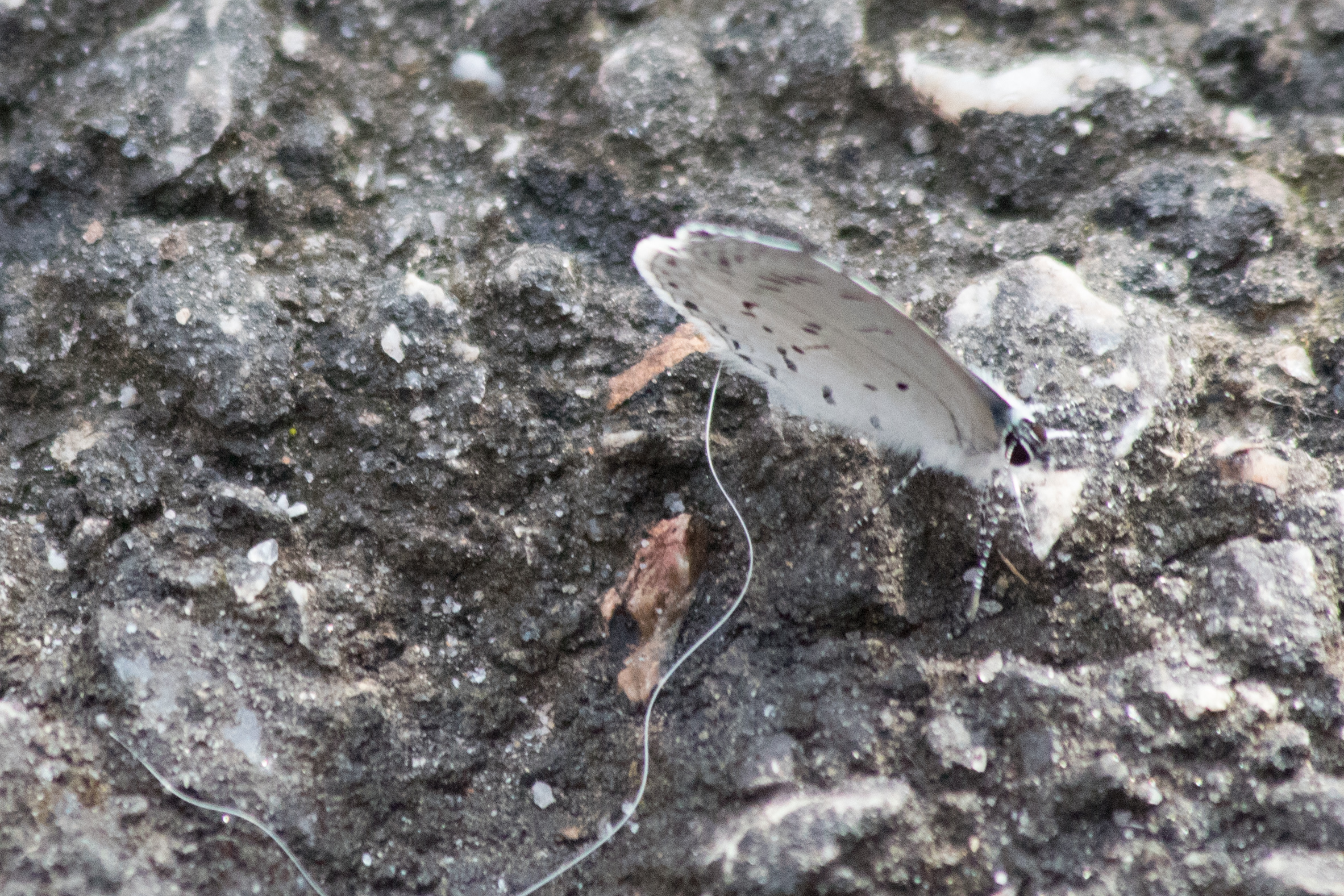 Observation notes: This thing was flitting around so fast I could not get a decent photo. The opened wings were bright blue. I believe this photo does show the markings of a Holly Azure, but I would not be surprised if I'm wrong. The temperature today was 80 degrees F, which for February here in Virginia is uncommonly hot. Sunny. It was on a wooded trail - lots of American holly trees, but also persimmons and pines. I do not know what the string near it is (probably someone's dental floss) but it was not attached to the butterfly or anything.