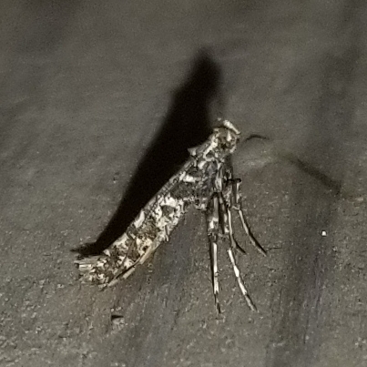 Observation notes: Fluttered by and landed to rest on a roof truss/joist beam near a porch light.