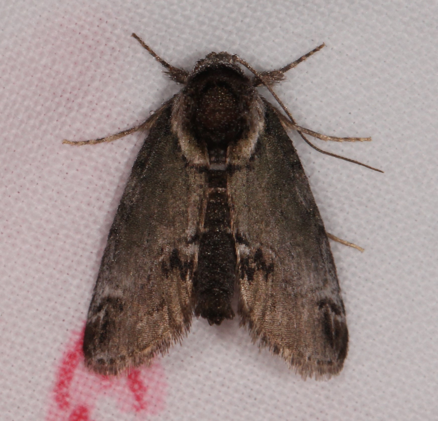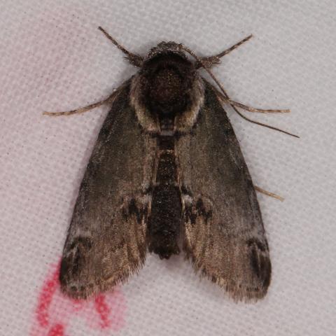 Observation notes: Attracted to MV lamp / blacklight set up along margin of mixed pine-hardwood stand with dense understory. Part of larger residential parcel with freshly mowed yard and small horse pasture. Clear sky, no wind, humid, temp 66 F. Total length of 12 mm.