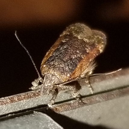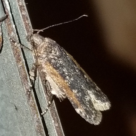 Observation notes: Fluttered by and landed to rest on a roof truss/joist beam near a porch light.