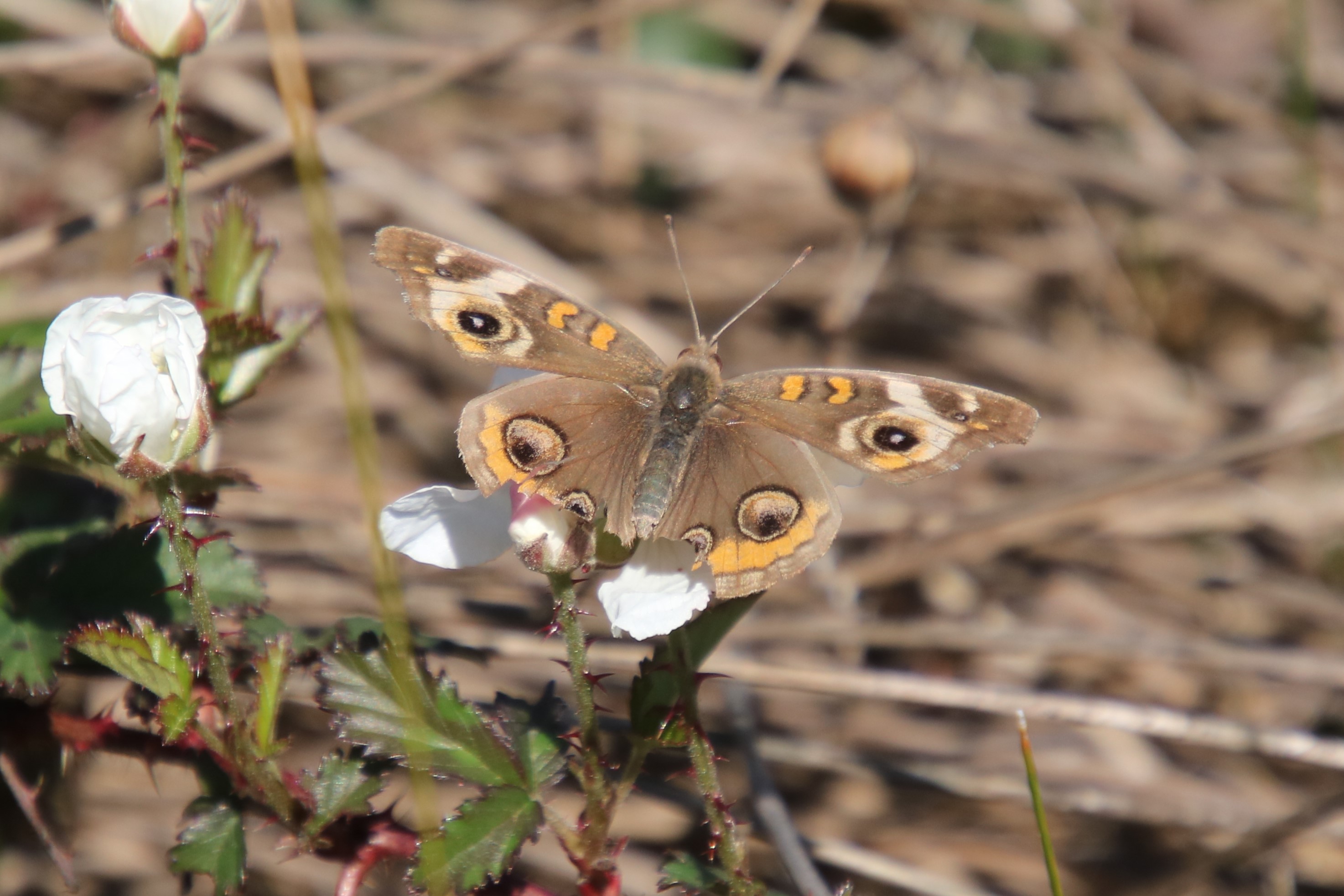 Observation notes: Warm and sunny conditions here on the Texas Gulf Coast on this day. The butterfly looks warn. Nectaring on the bloom of dewberry vine.