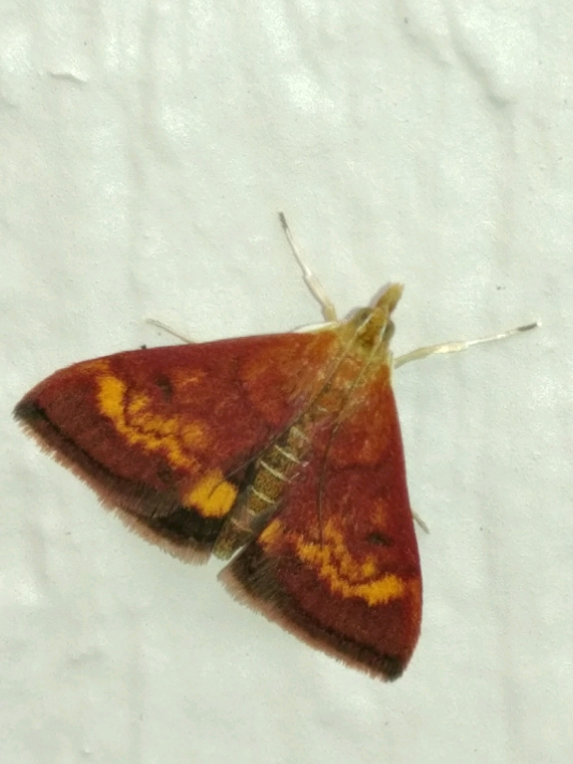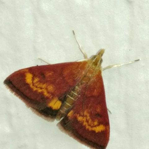 Observation notes: About 14 degrees C, windy and cloudy; moth was stationary - on frame of garage door. Moth about 1 cm in length.