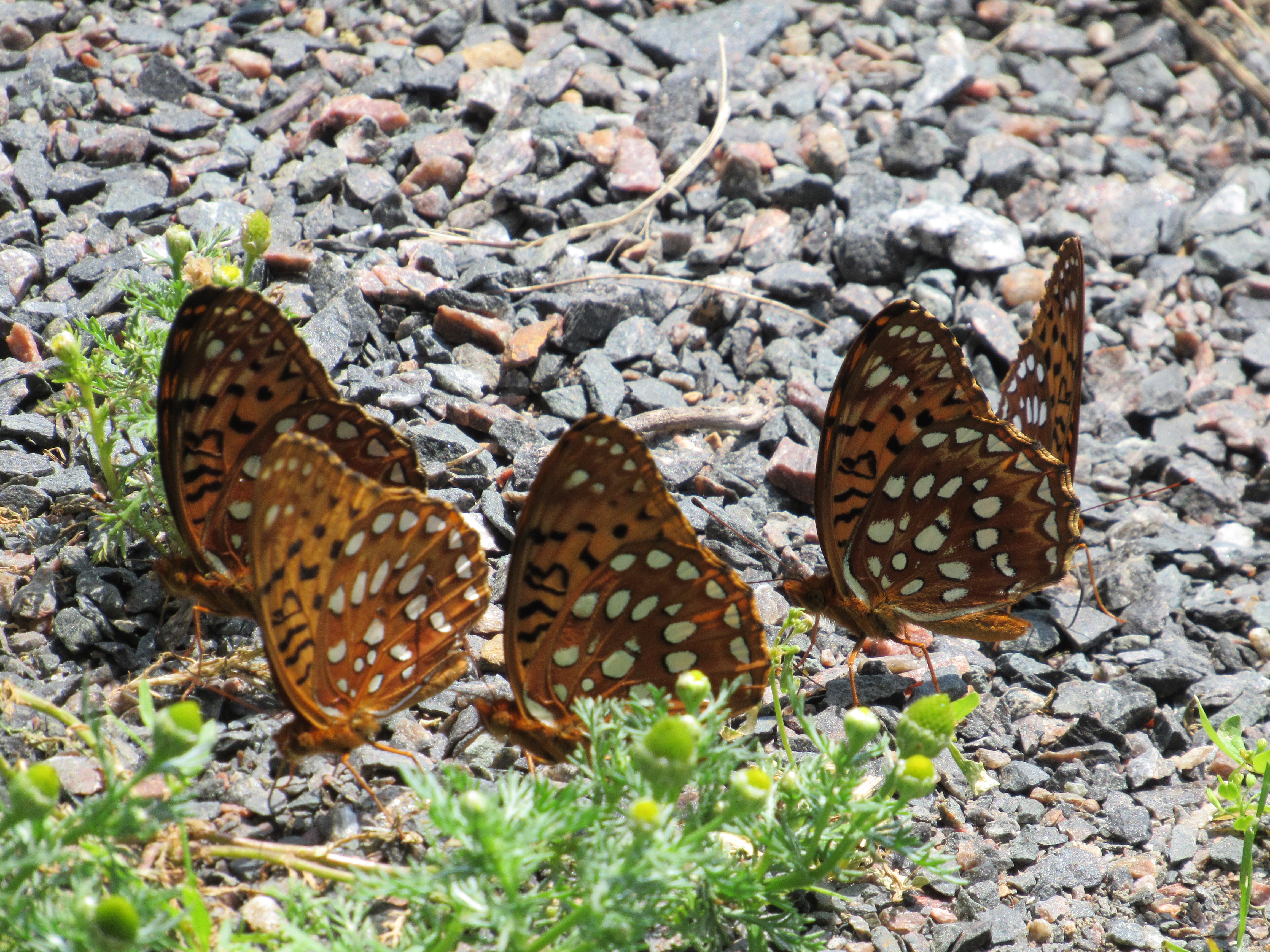 Observation notes: At least 10 fritillaries were flying near the pull-off. Most appeared to be aphrodite fritillaries (after looking at photos and guides), a few were great spangled fritillaries. There were a couple of other species of butterflies there too. Many were sitting together in the gravel, others were landing on various grasses and flowers including butterfly milkweed.