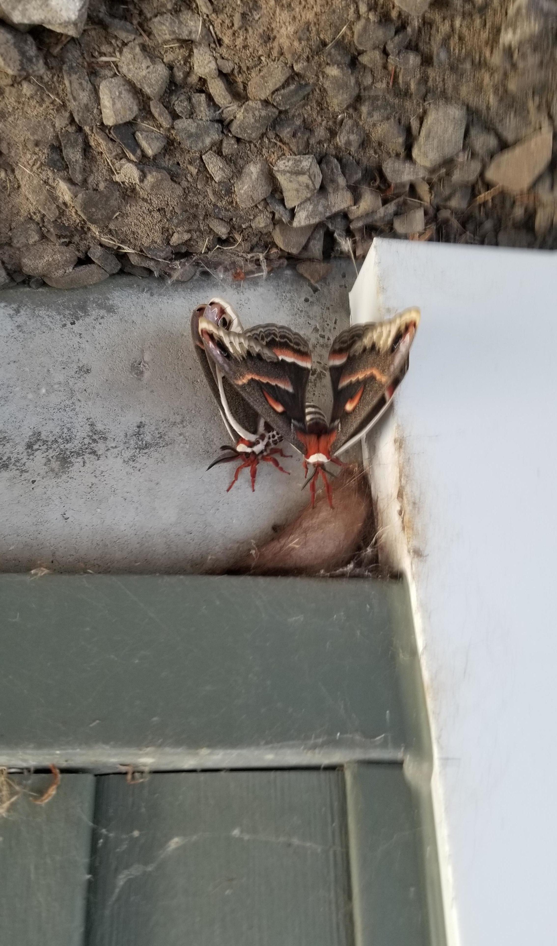 Observation notes: On a side of a building with a gravel driveway. Female has remained in the same place after mating has taken place. Doesnt look like she is laying eggs but her body is deteriorating exposing the eggs.