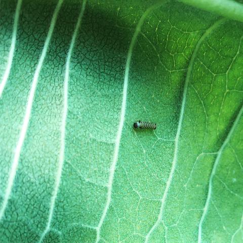 Observation notes: Monarch caterpillar only a few days old. Hiding under a common milkweed leaf located in the shade. Air temp was around 90 degrees Fahrenheit.
