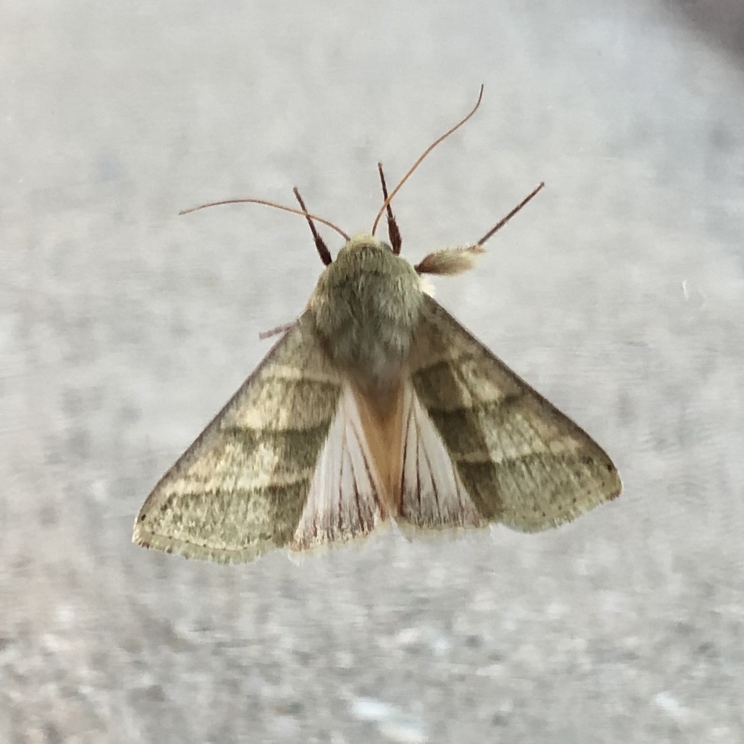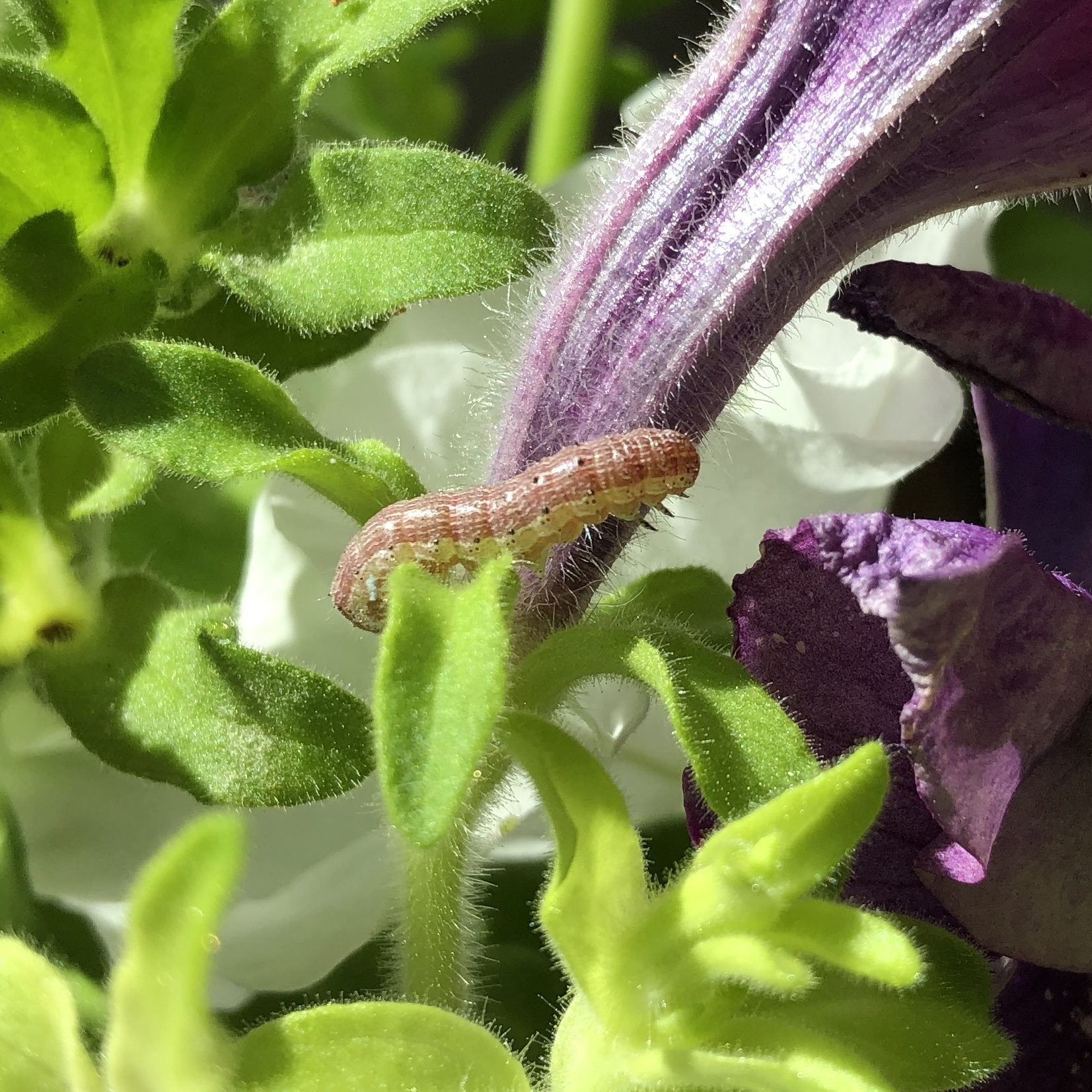 Observation notes: One inch long (at largest) larva change colors depending on what they eat. Brownish purple on purple petunia flowers. Light green on the white flowers. Eating petals only. Captured one into a jar and allowed it to pupate in a thin layer of soil. The moth that emerged 23-24 days later is shown.