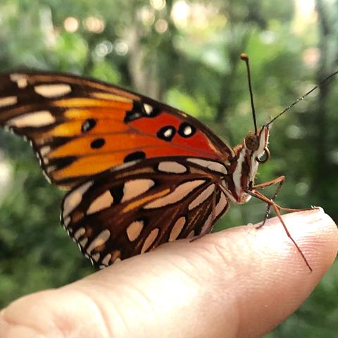 Observation notes: Spotted of porter weed in driveway, held hand for it to crawl onto, relocated to nearby passion vine
