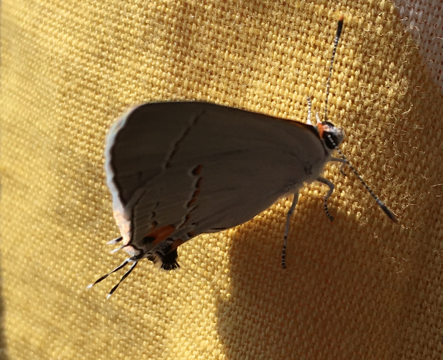 Observation notes: The butterfly landed on my shirt and stayed for a few minutes. I was standing outside the airport in Burbank, California, waiting for a ride.
