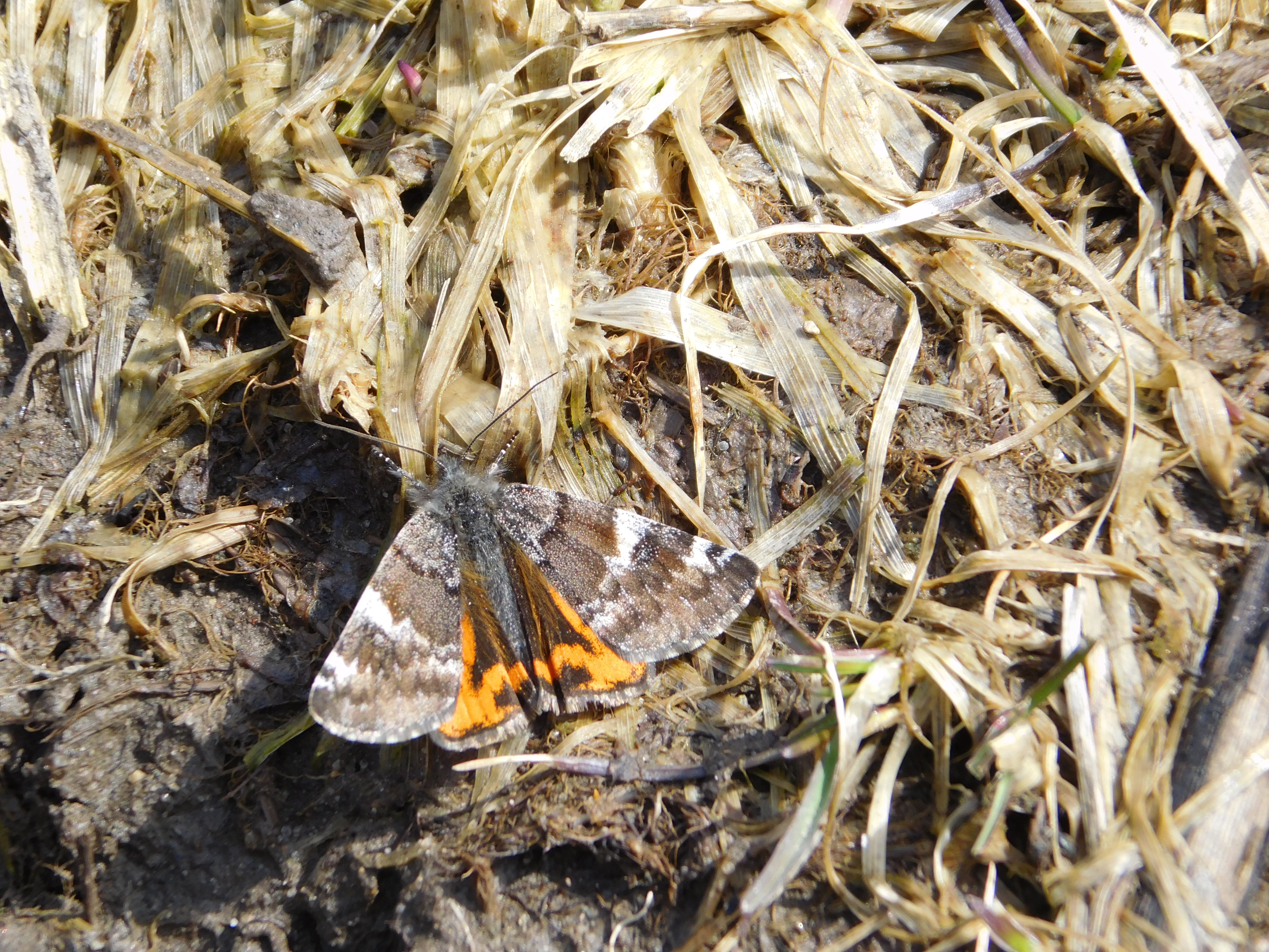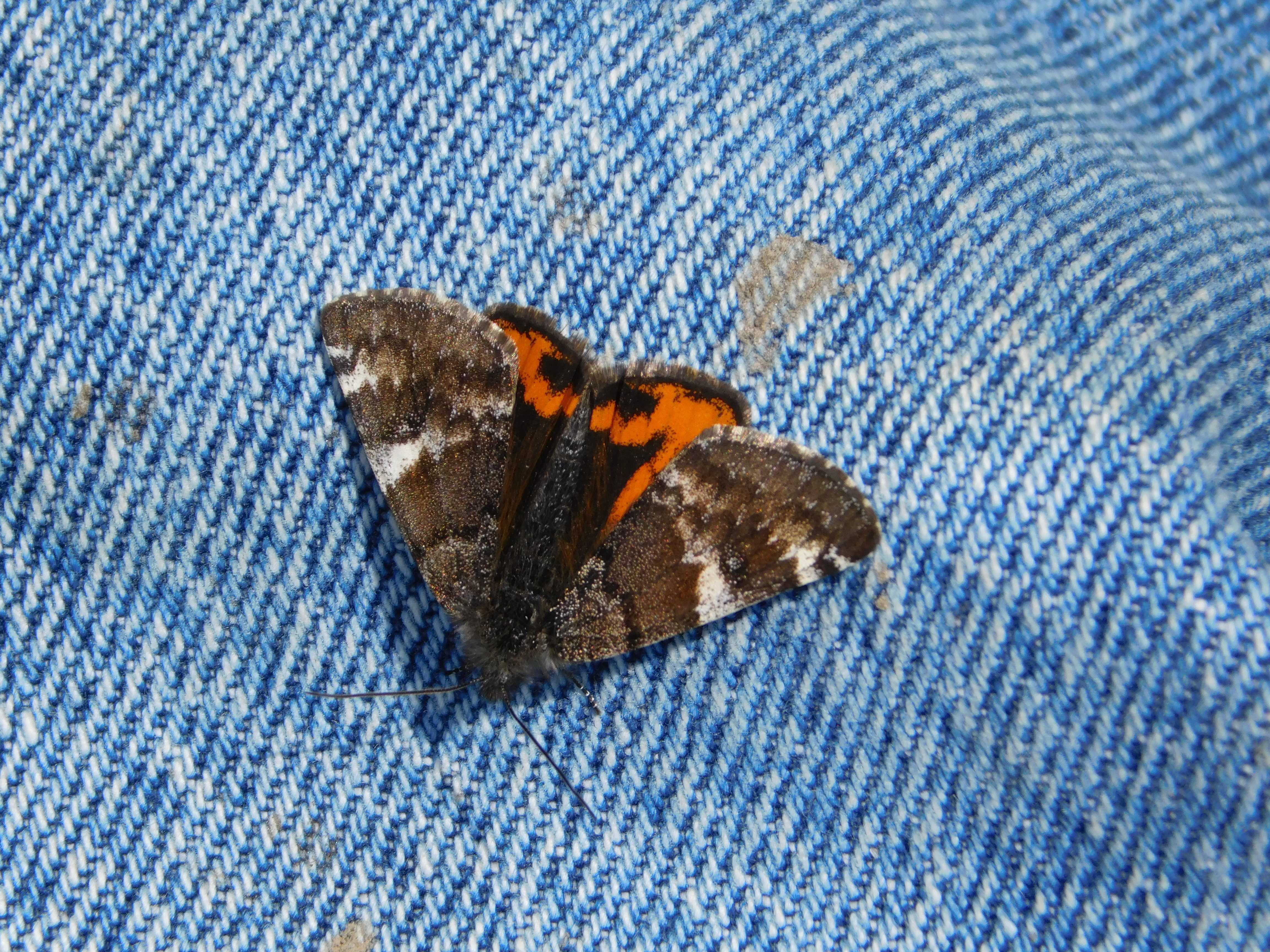 Observation notes: 45 degrees. Partly cloudy. Rested for long periods with wings open on moist muddy ground. Landed on my leg for a while.