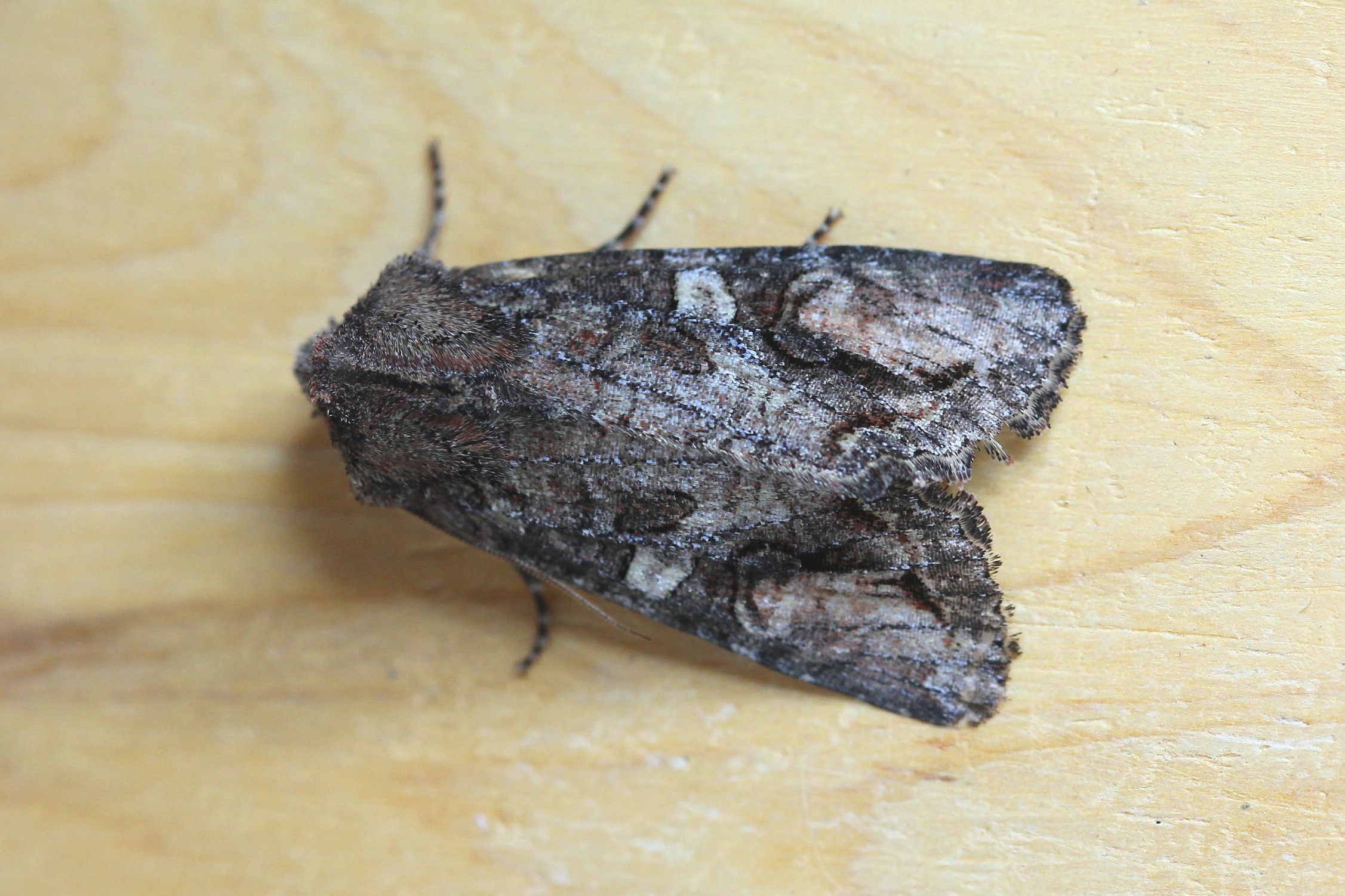Observation notes: Length 21 mm. Fluorescent UV light set up from 9:00 pm till 11:00 pm. Dirt road through closed canopy Douglas-fir forest with understory of maple (Acer glabrum).