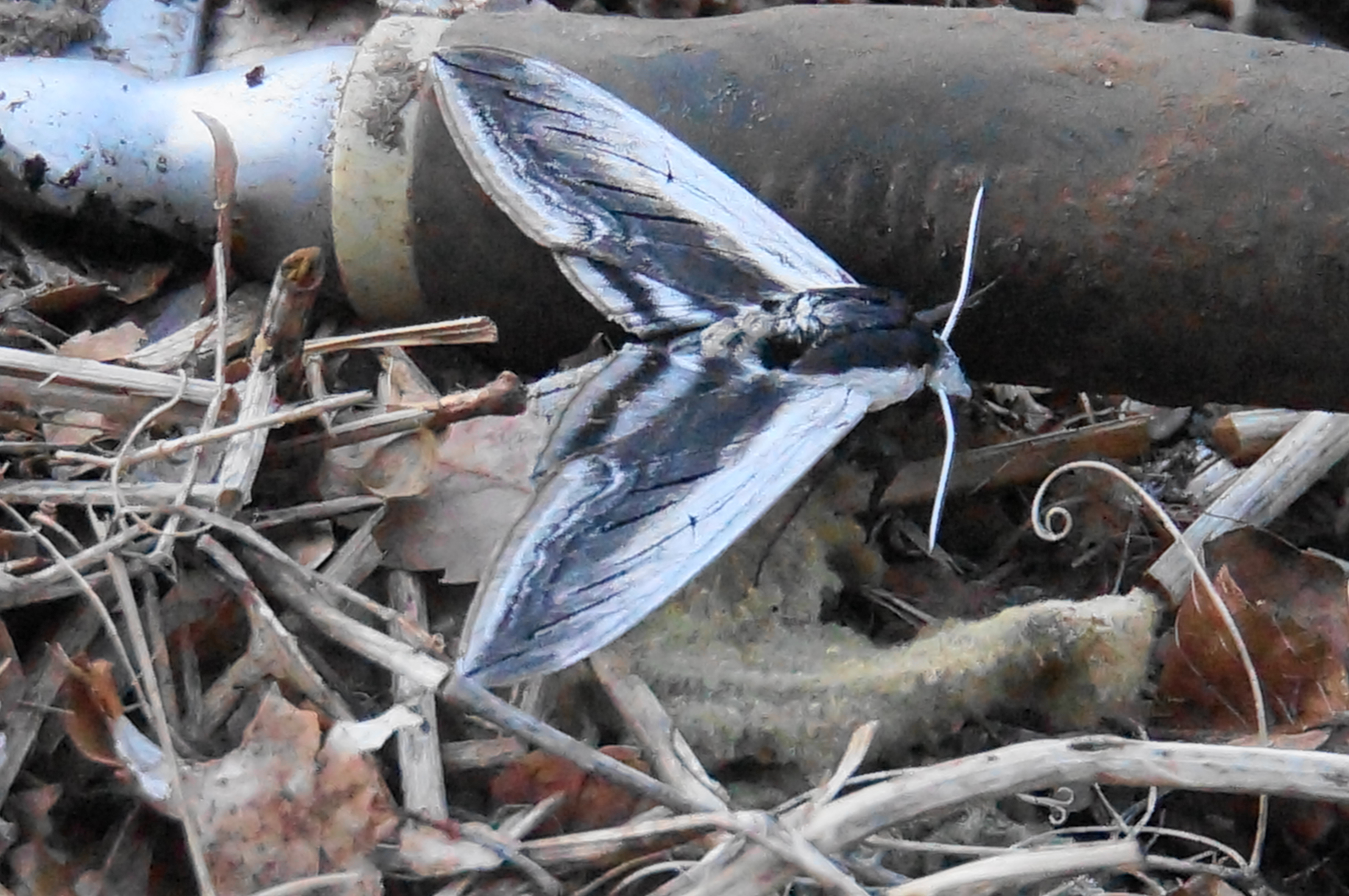 Observation notes: Cloudy but dry day after several rainy days. Large moth found resting in leaf litter below Akebia vine on garden bed in backyard. It was also near old sunflower stalks.