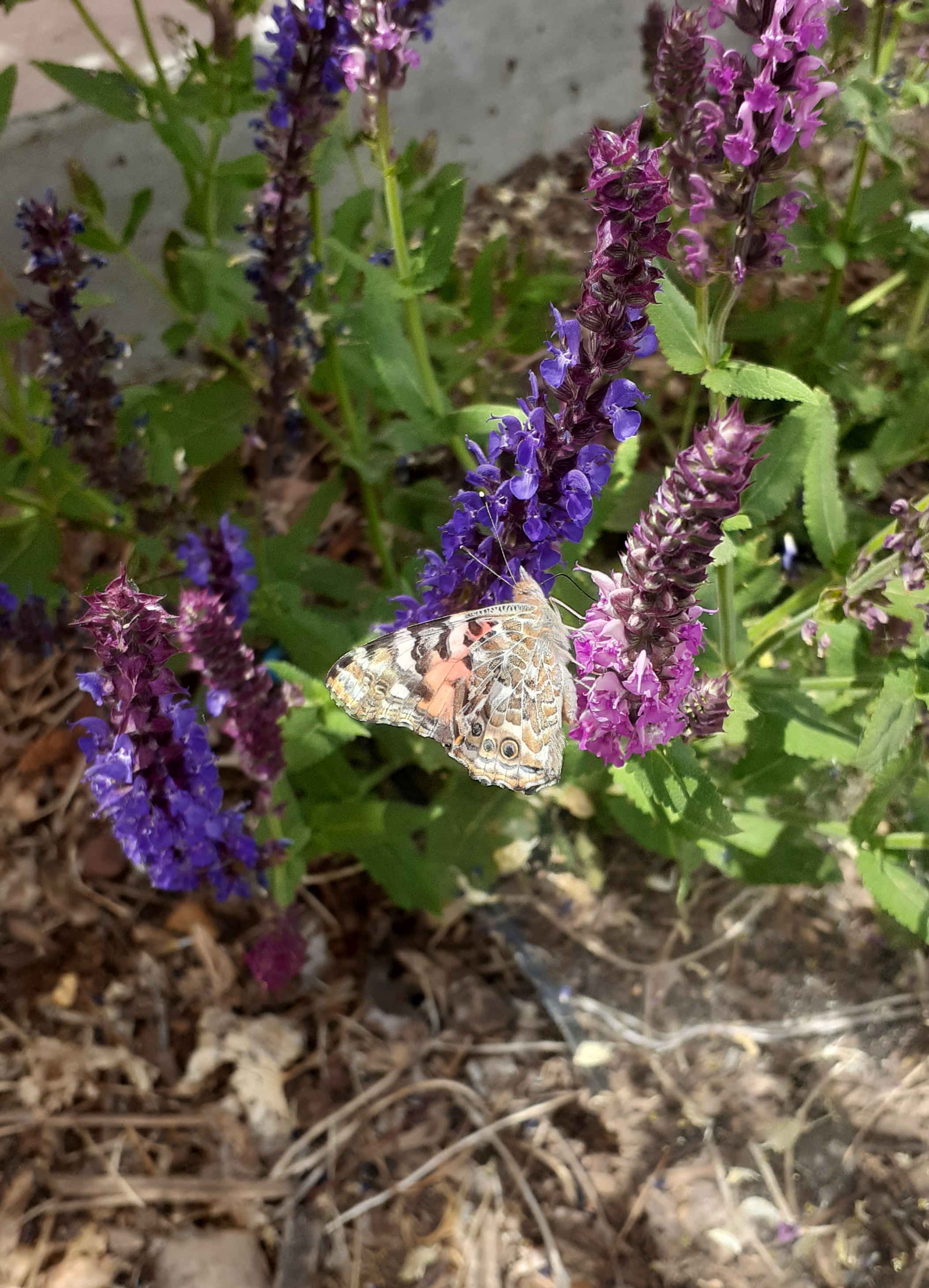 Observation notes: Four butterflies feeding on purple meadow sage plant in the shade. 99 degrees farenheit, sunny, partially cloudy at the time. They weren't feeding on any of the meadow sage that was in the sun.
