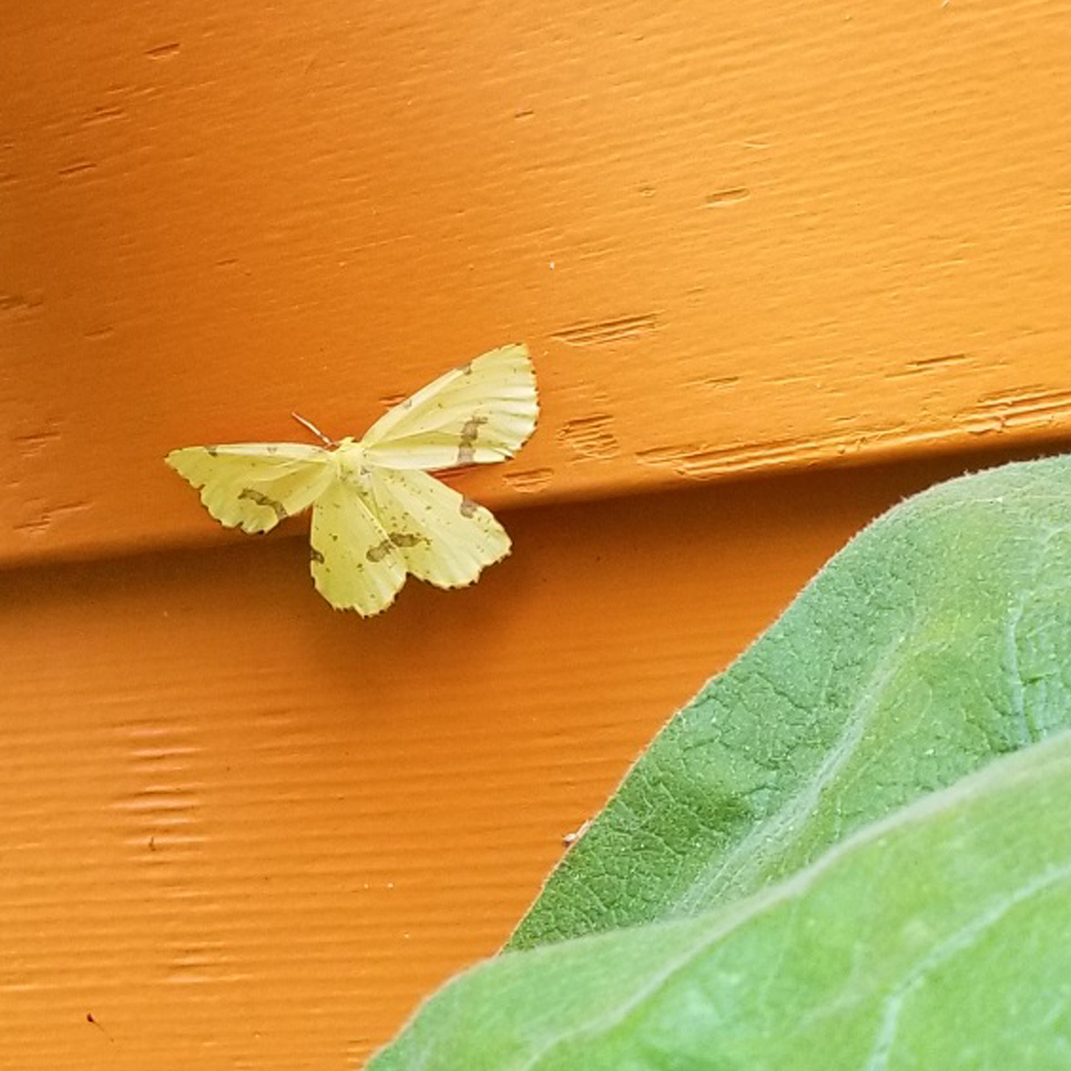 Observation notes: on outside clapboard behind mullein plant. color of clapboard is accurate...moth presented as pale green