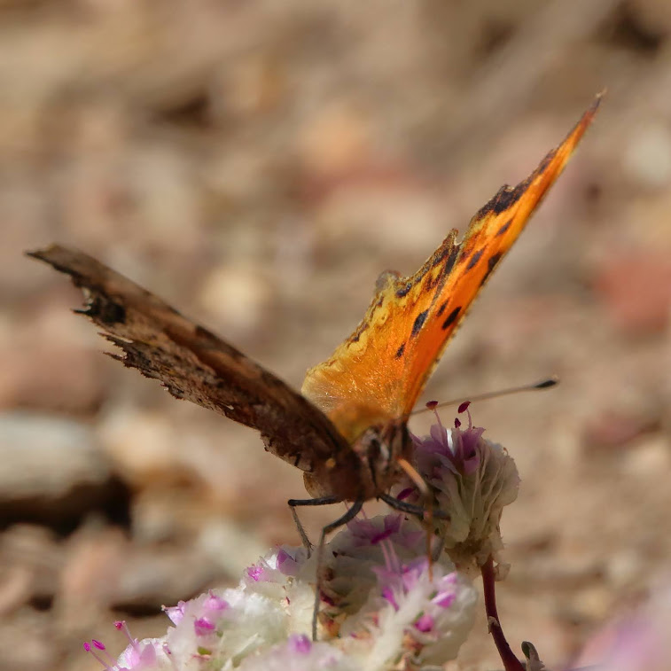 Observation notes: A number of them at Eriogonum. Seen subsequently puddling. Confusing, and I am not certain, but the right angle to the comma and the yellow spots paralleling the underwing margins were quite clear on the photos.