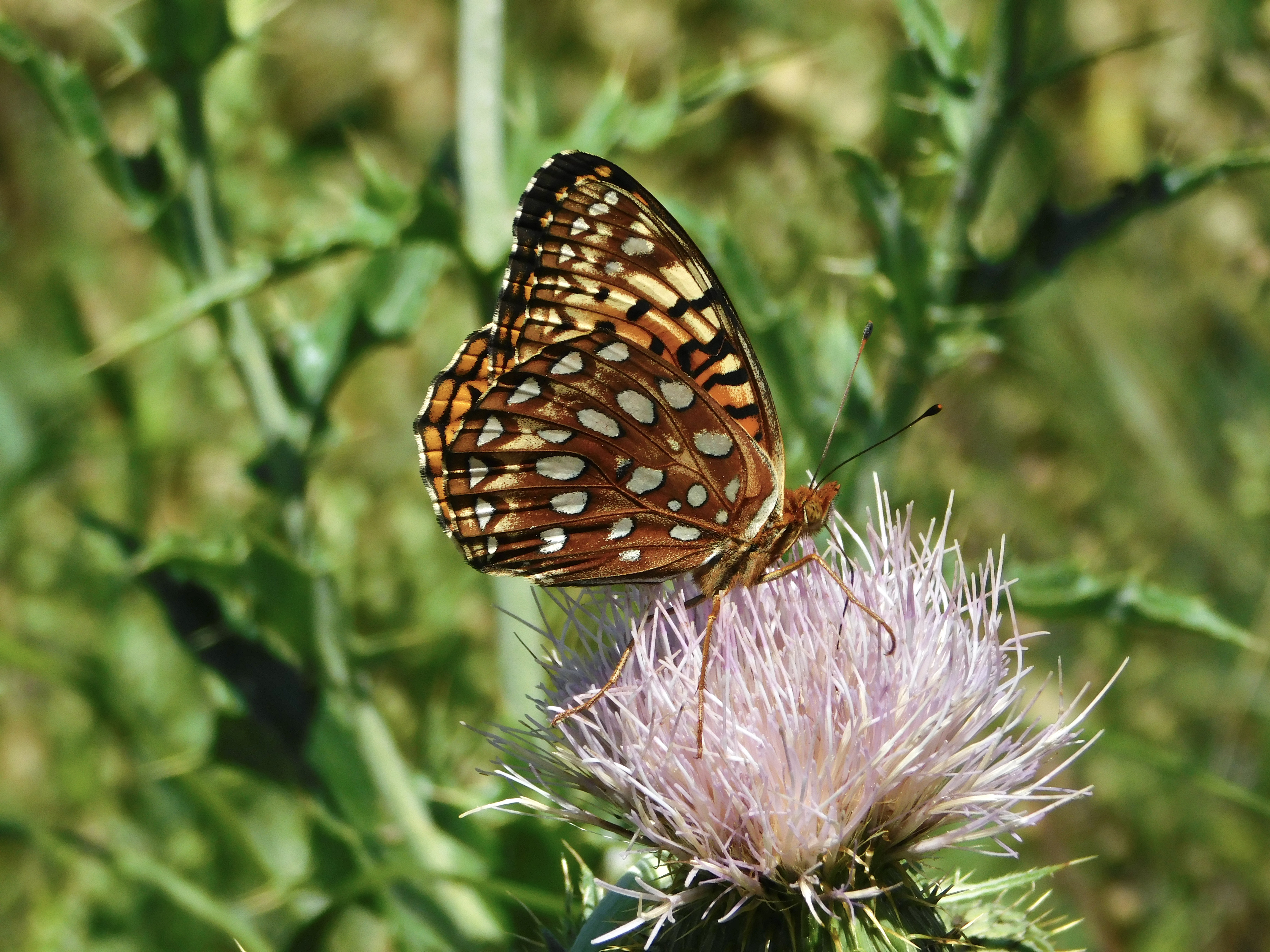 Observation notes: This was a very large butterfly (makes me lean toward Atlantis), and the colors of the Aphrodite underwing look too pale. To me, this looks most like the Eastern Aphrodite, but that makes no sense range-wise. I'm having a hard time with this ID, esp. because I wasn't able to get a good shot of the upper wings.