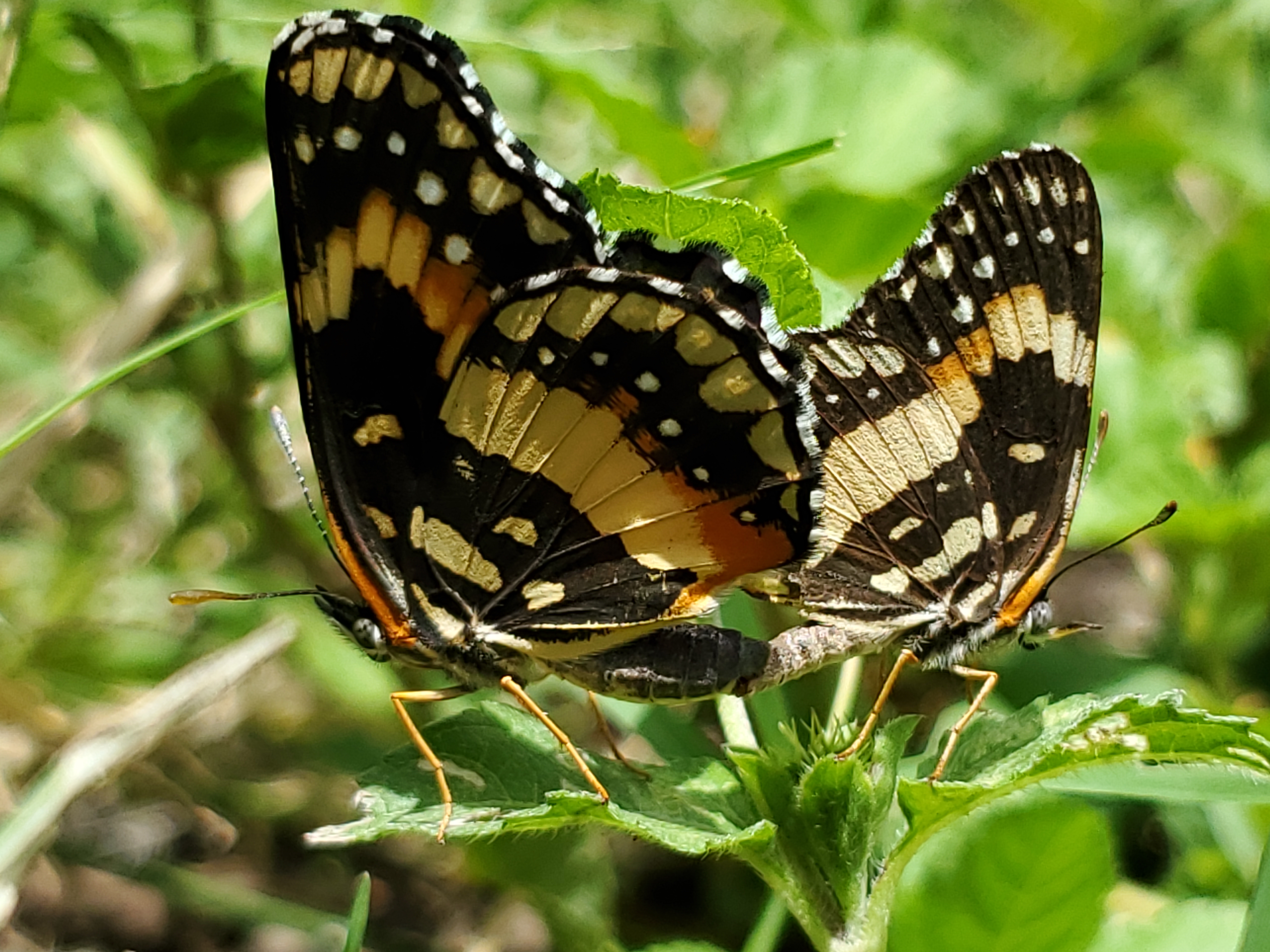 Observation notes: Mating in grass. Host plants nearby common wild sunflower and giant ragweed. Hot dry sunny summer day.