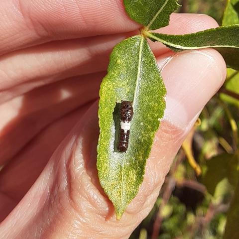 Observation notes: I saw two of these little caterpillars on a young tree along the trail. They both stayed on the same leaf the whole time I was watching and didn't move at all. I think this isn't a tiger swallowtail because of the habitat, a desert foothill canyon, and because I have only, as far as I know, seen two tailed in the foothills.
