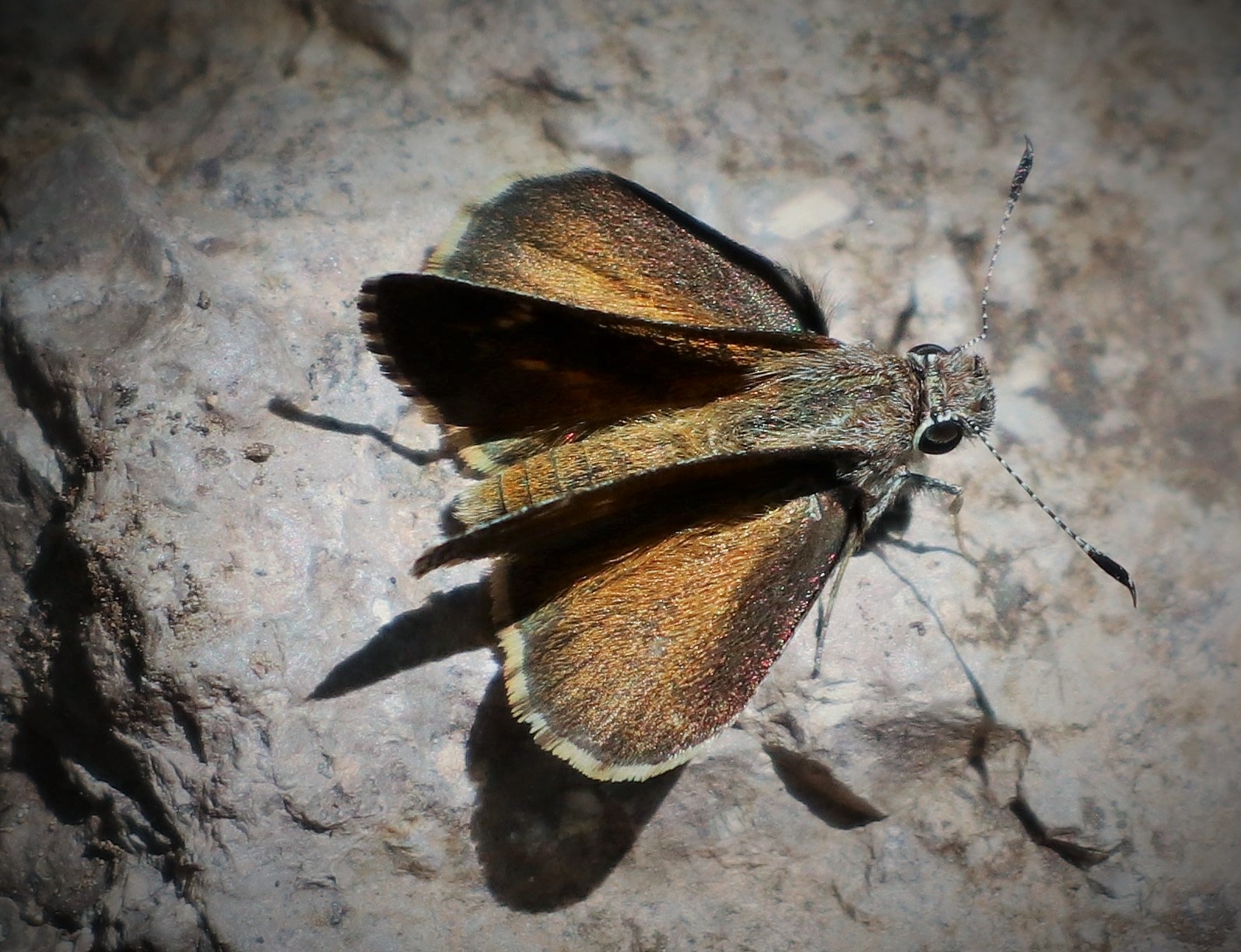 Observation notes: Dark brown skipper (one of 4) taking nutrients from moist soil and small rocks near the head of Soledad Canyon. The site was dappled with shade from maple leaves on a breezy, hot day.