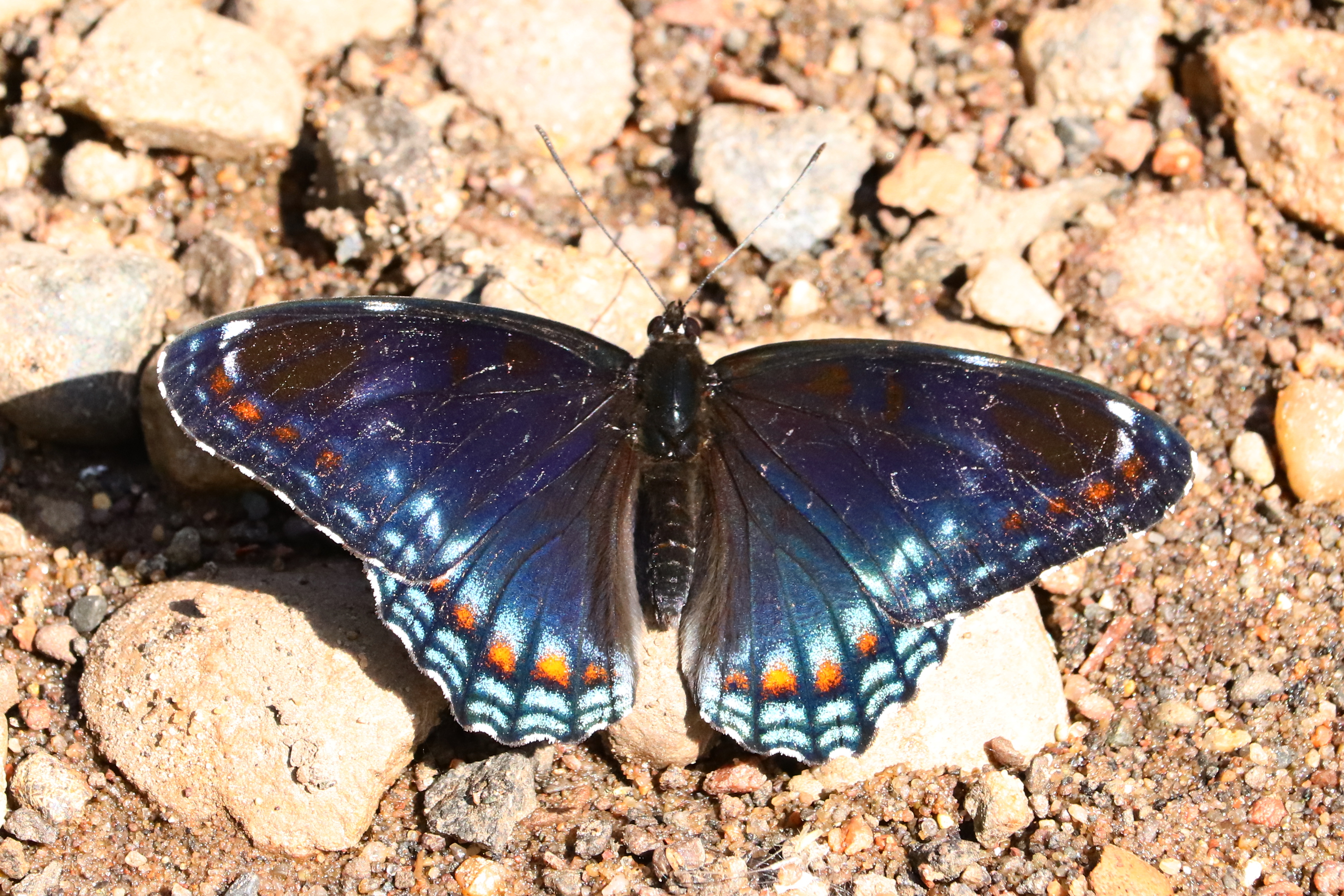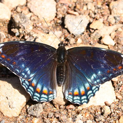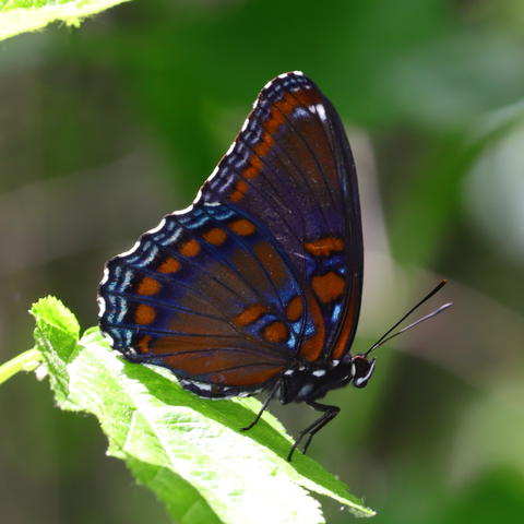 Coordinator notes: The first photo you have a cool-looking intergrade between the White Admiral and Red-spotted Purple. You can tell by the faint white band traversing the middle of the FW. The second photo appears to be a pure Red-spotted Purple. White Admirals and Red-spotted Purples are actually the same species, with the former a more northern variant, and the latter a more southern variant. Chippewa County exists in the transition zone between the two, where you can see either form, or various intergrades between the two. -jmgesell