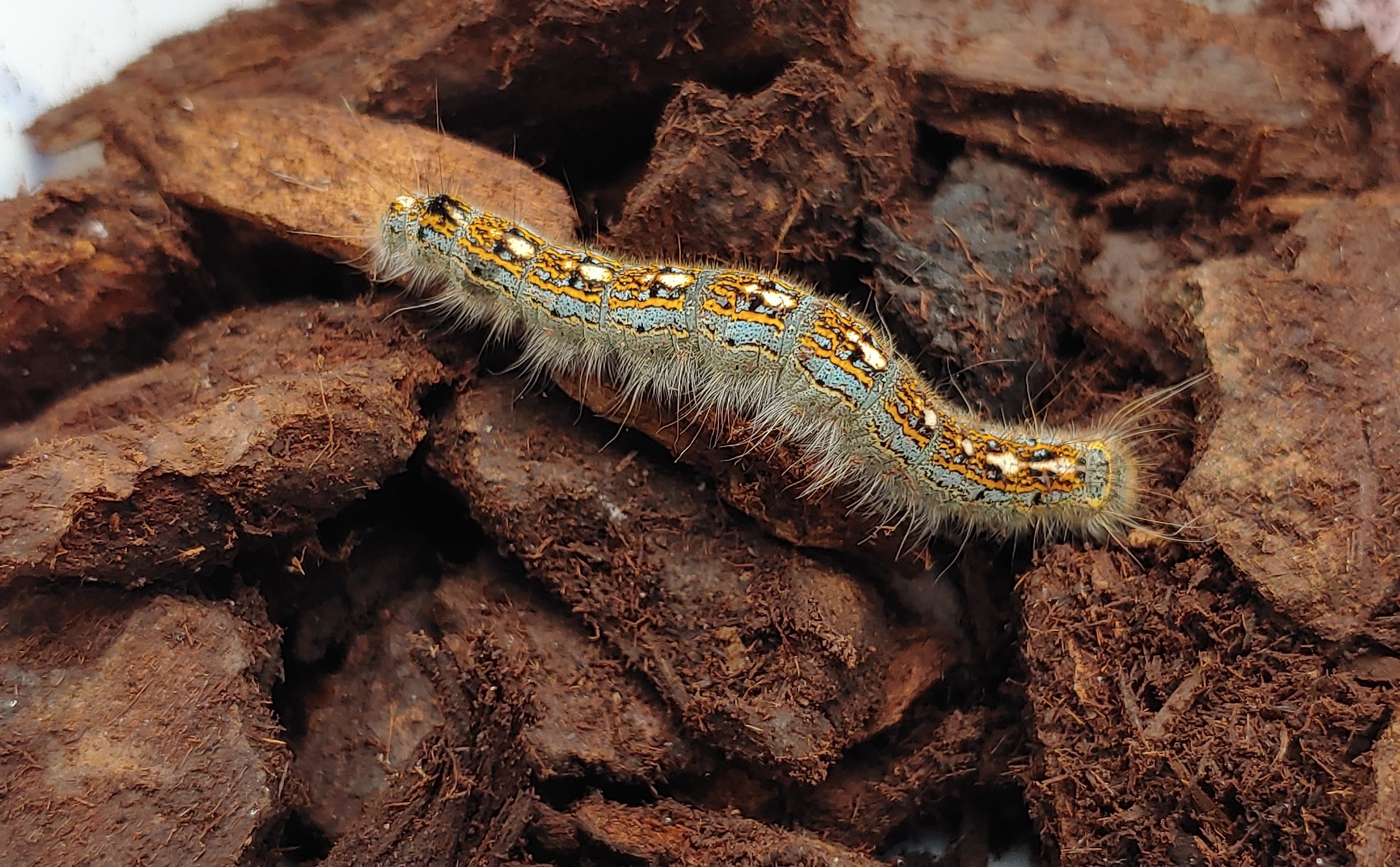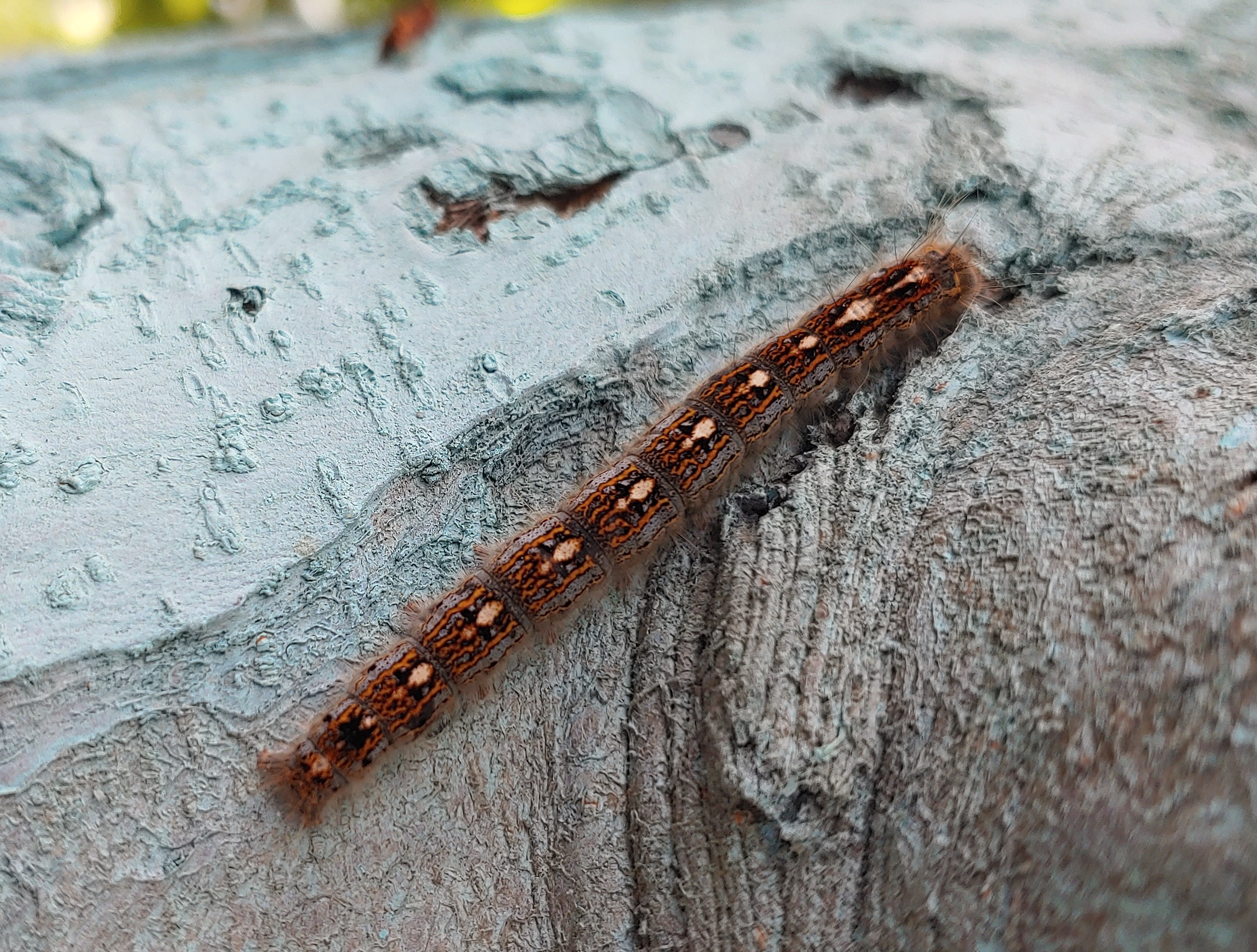 Observation notes: Found this Forest Tent Caterpillar "sleeping" on my Golden Delicious apple tree trunk. Partly cloudy day around 70 degrees.