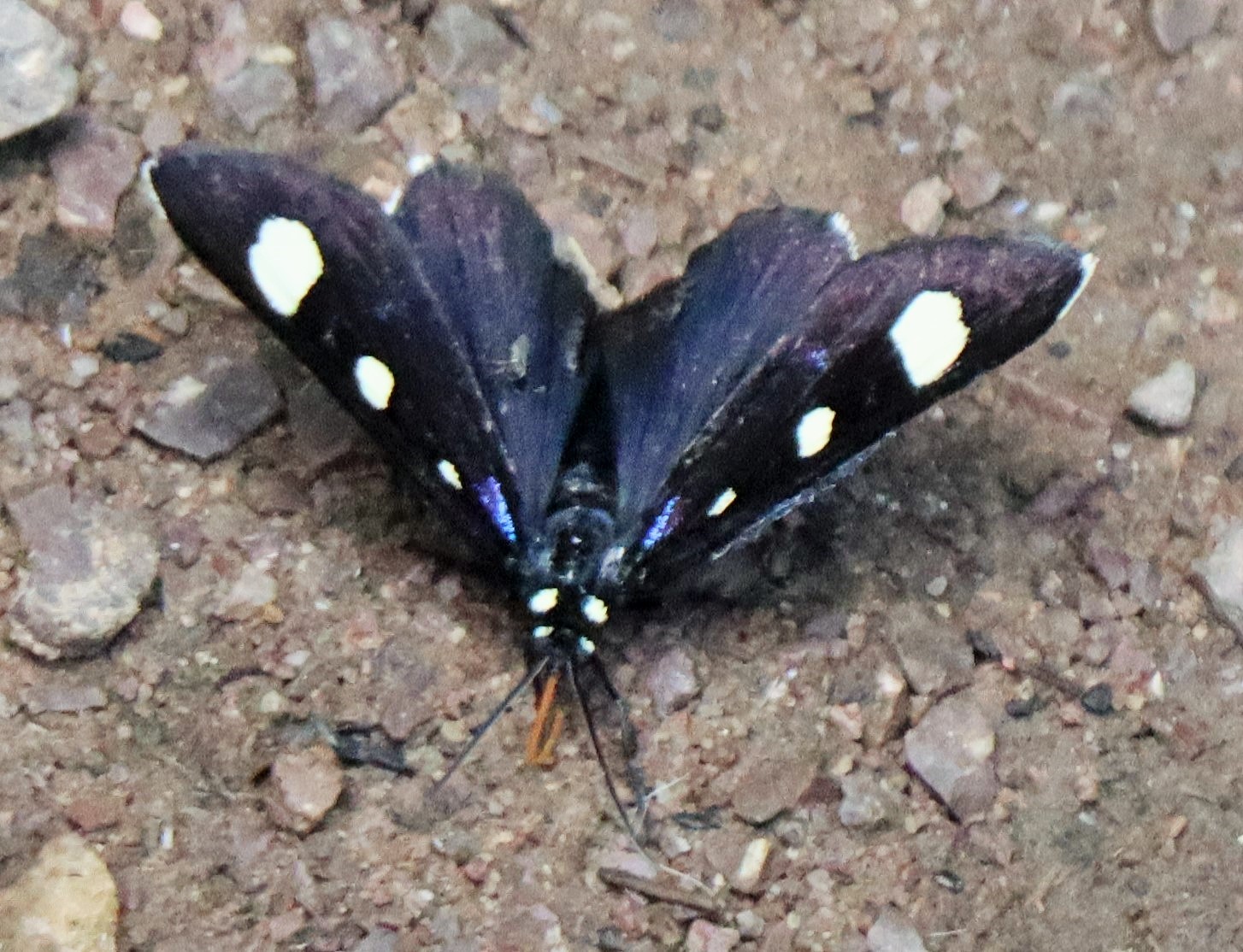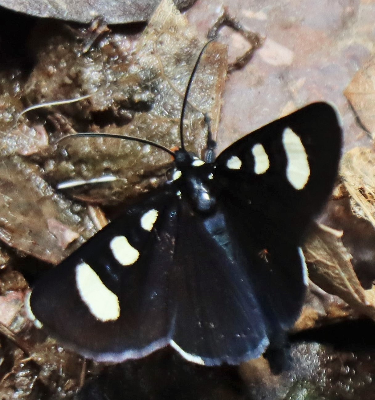 Observation notes: Medium black moth with distinct dorsal outer-wing ovals in yellow and vivid blue inserts between them. This and another werre observed taking nutrients from moist soil and flowing water at the head of Soledad Canyon, mid-slope of the Organ Mountains. Individual spent nearly an hour in dappled shade and at the exposed headwall base. The early afternoon was hot, mostly sunny, and with moderate wind gusts occasionally blowing up-canyon.