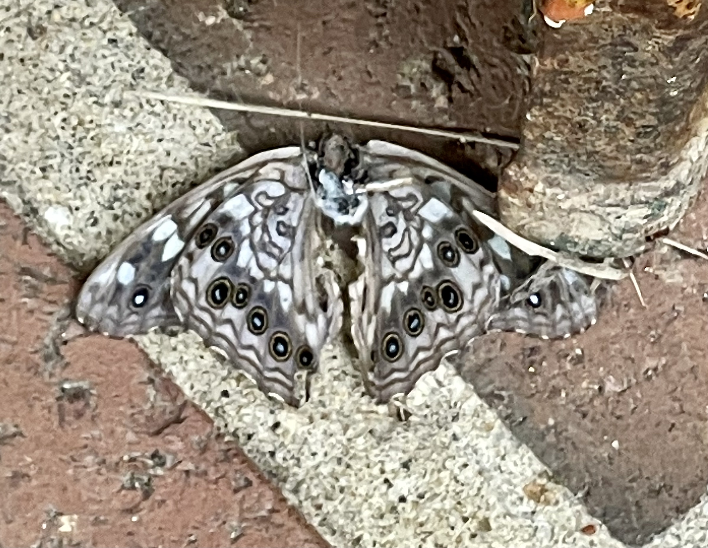 Observation notes: Found on porch, recently died and in good condition except antennae appear to be missing. Weather today was cloudy and drizzling rain. I can't really tell whether it's a butterfly or moth. (I assume this view is the underside of the specimen.)
