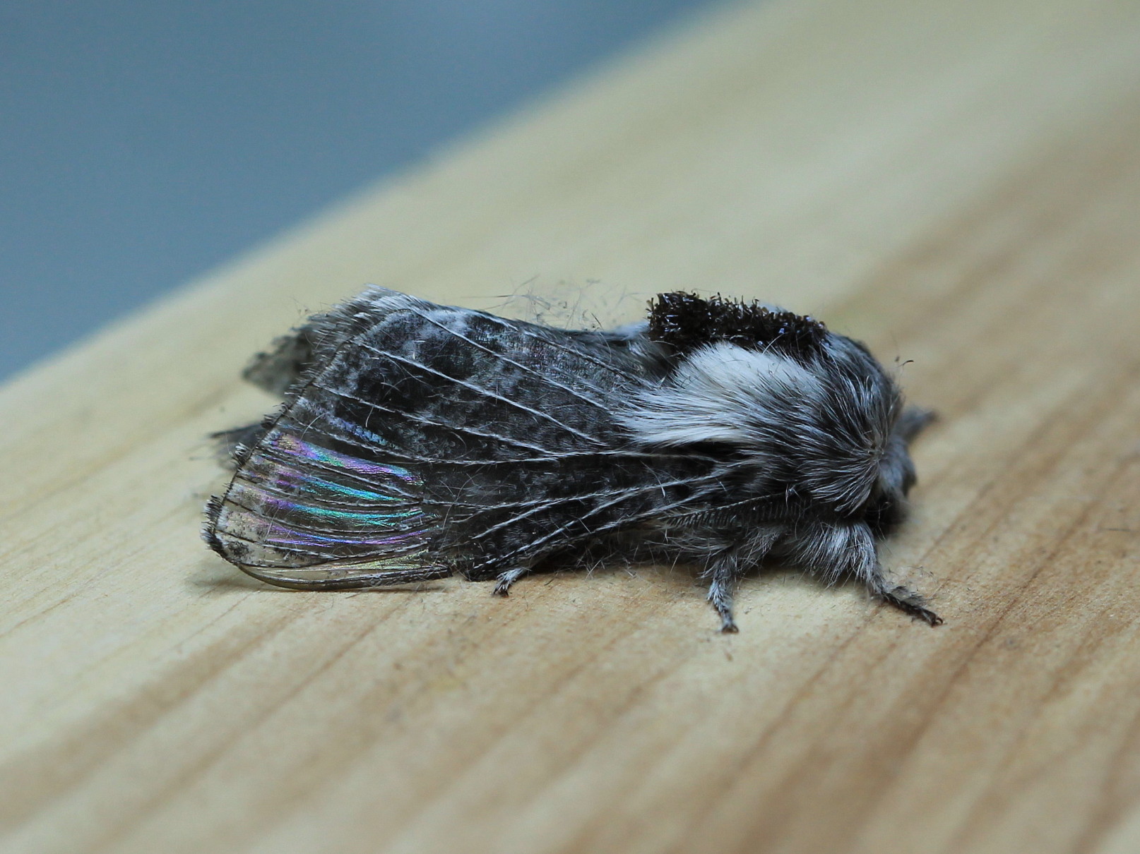 Observation notes: On a shaded concrete wall. Appeared in pristine condition but after carrying it home in a small bottle it had beaten itself up so badly that the bottle was filled with what looked like a dust bunny.