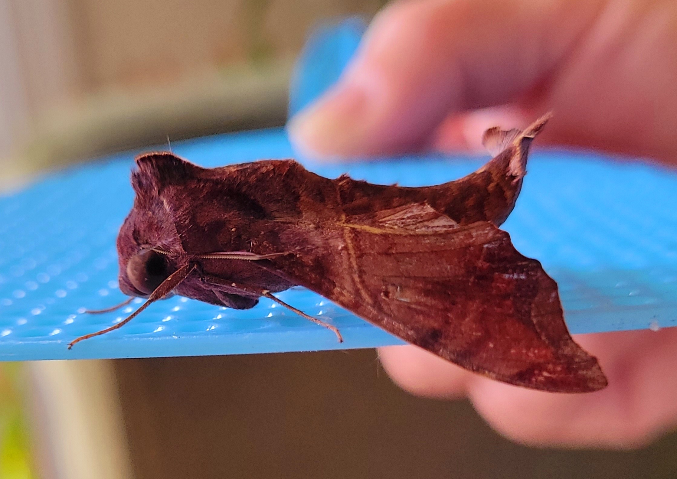 Observation notes: It flew in to our home and landed on a light fixture. We gently slid a fly swatter under it to carry it outside. As of 18 hours later, it's alive and clinging to the swatter on our back porch.