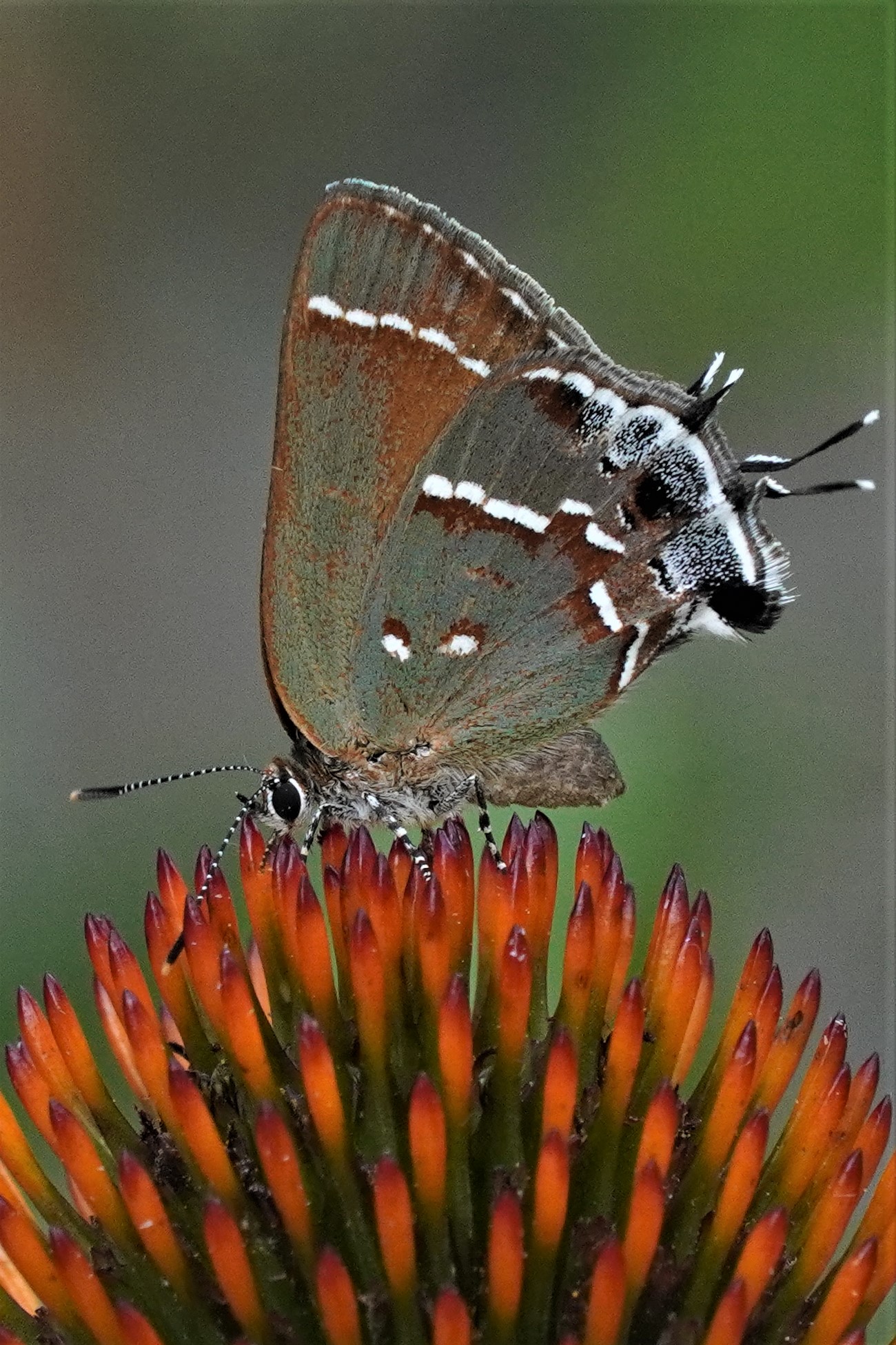 Observation notes: In my subdivision backyard nectaring on planted purple coneflower (as in image) and to a lesser extent on zinnia. Red Cedar is scattered and not abundant in the immediate area, red cedar planted in my yard only ~5 years ago and 8-12' tall. Apparently a first record for Leon Co., FL.