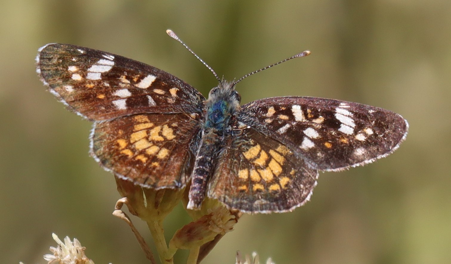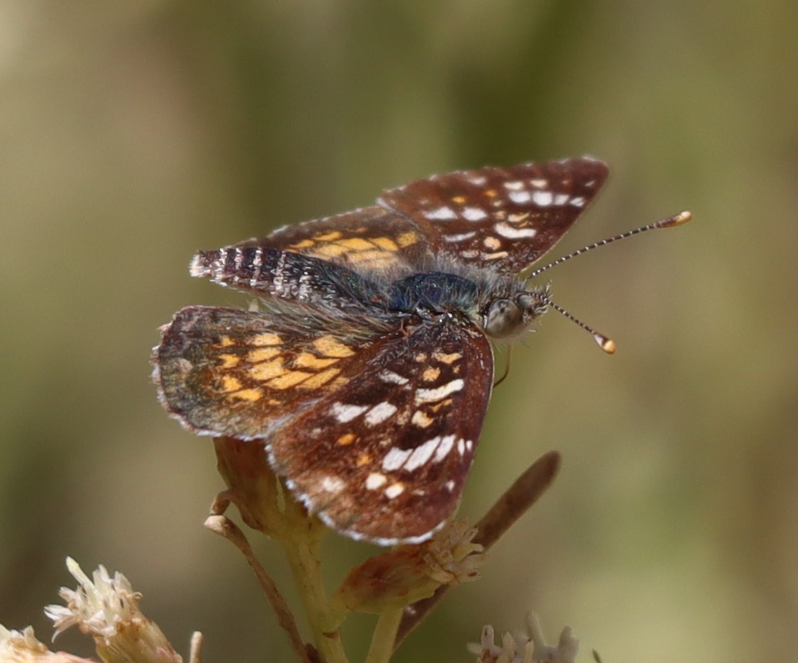 Observation notes: Dark-colored crescent nectaring from Baccharis flowers along the Rio Grande. Several of this species are active daily, mostly perched on Bermuda-grass and sometimes the only species observed. The mid-day was warm, windy, and under full sun.