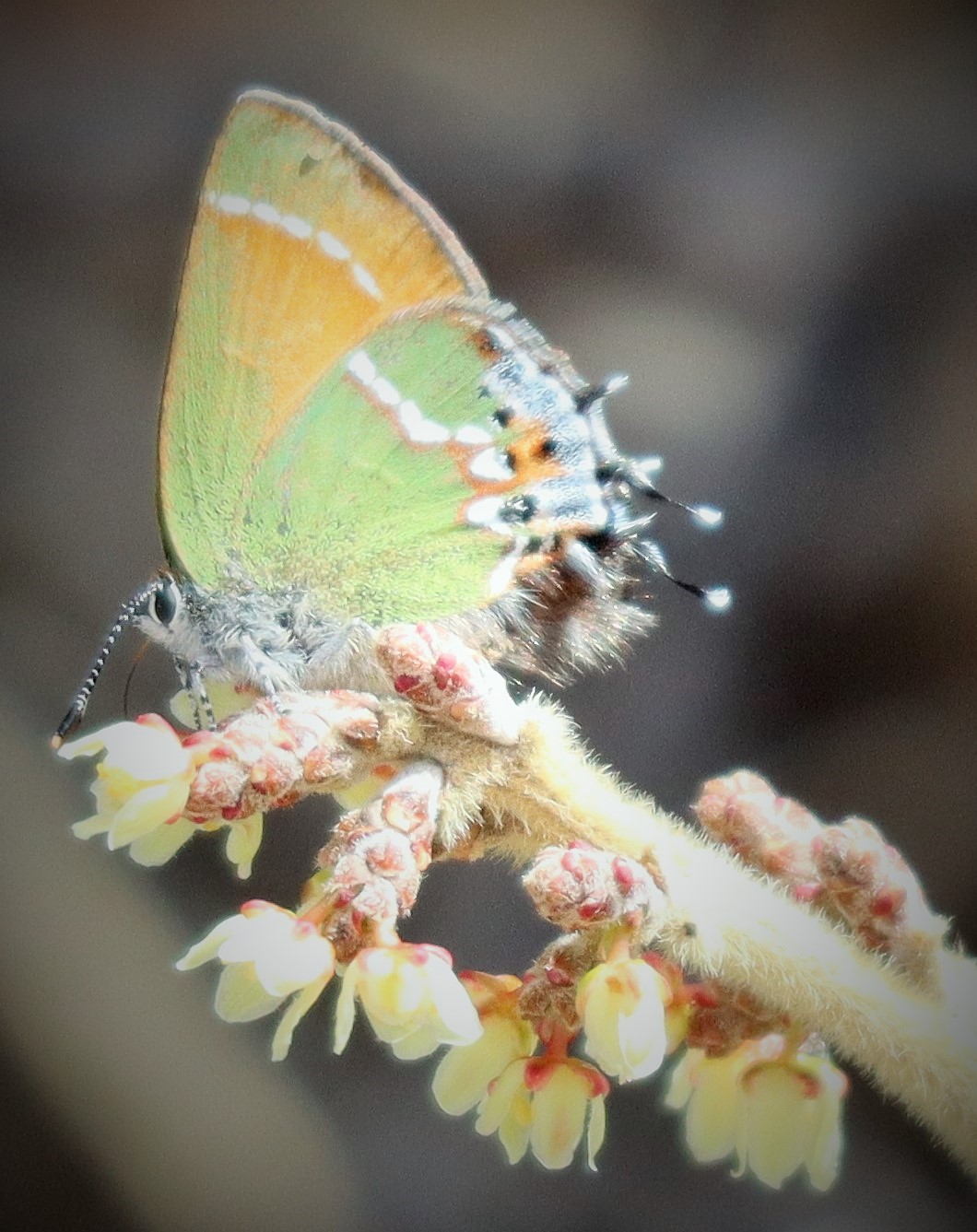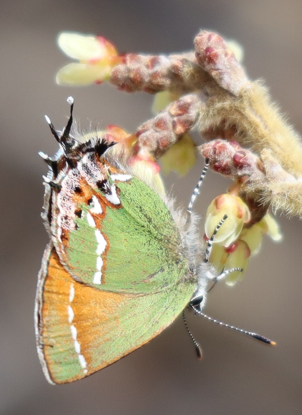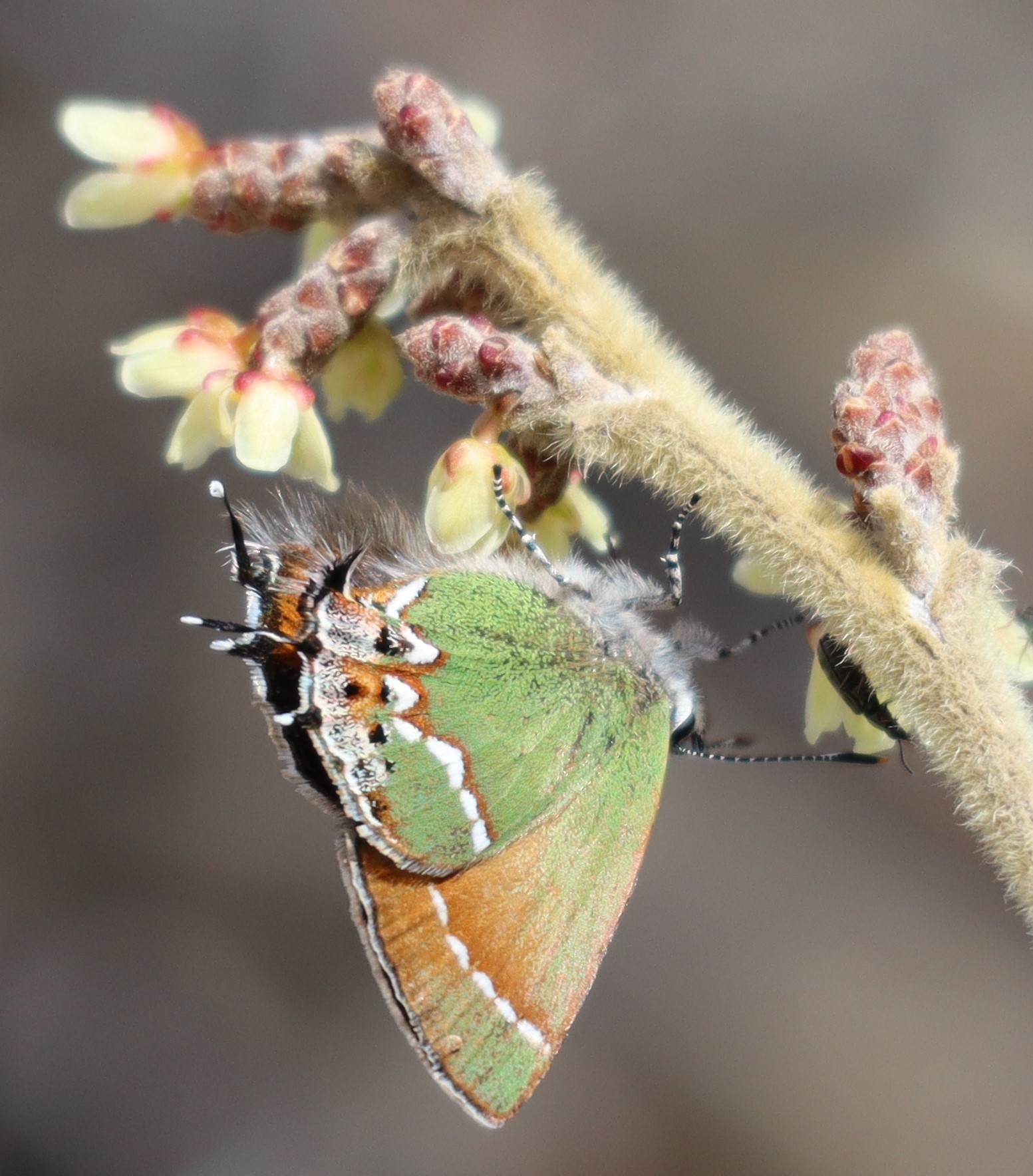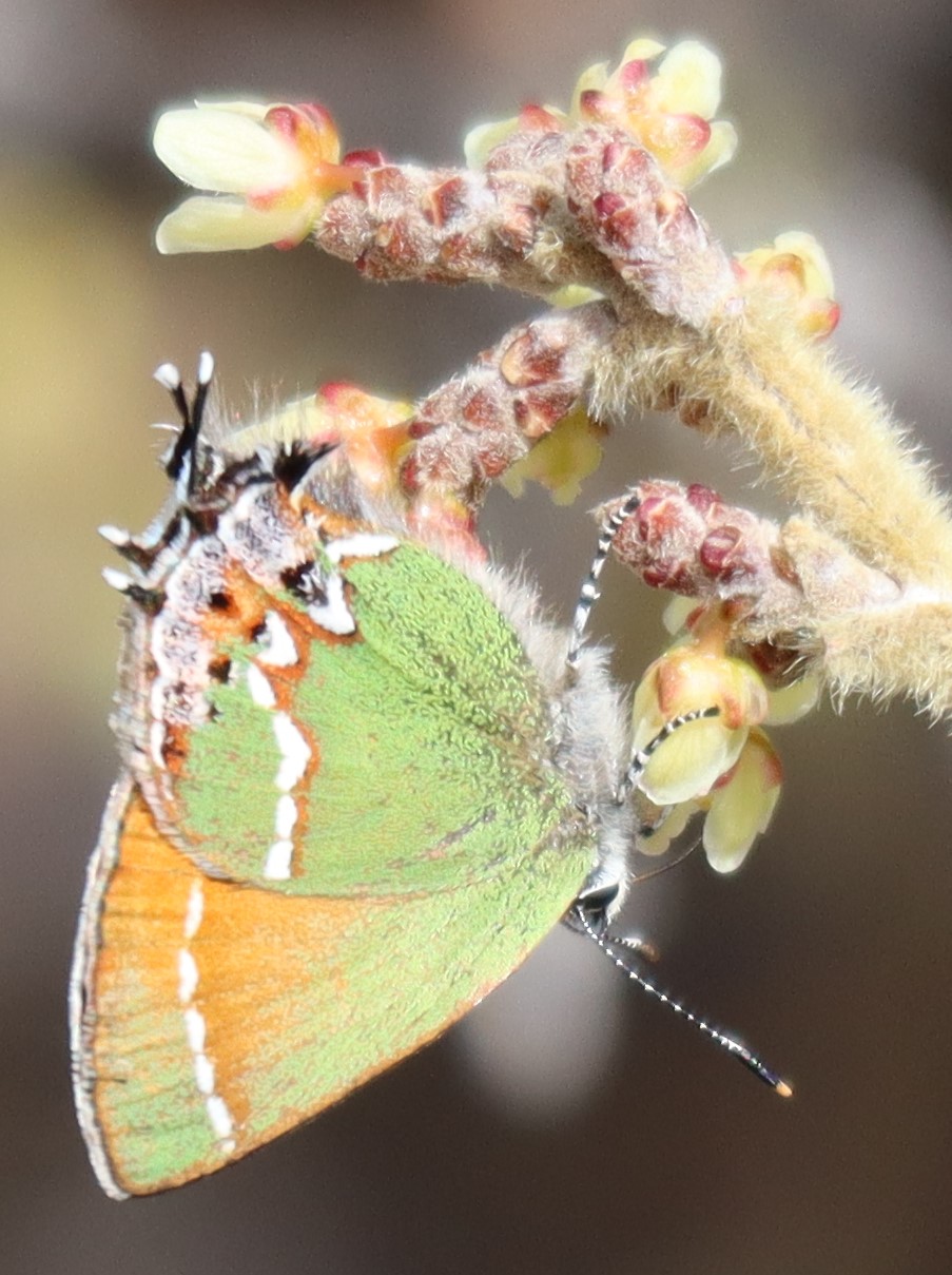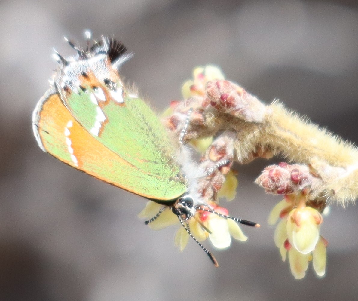 Observation notes: Hairstreak (1 of 2 individuals on this day) nectars from newly opened sumac flowers along the Pine Tree Trail, near the Aguirre Springs Campground, on the east-facing slope of the Organ Mountains. The early afternoon was sunny, cool, and with light winds. Also observed this day were several southwestern orangetips which were flying low and rapidly and could not be photographed.